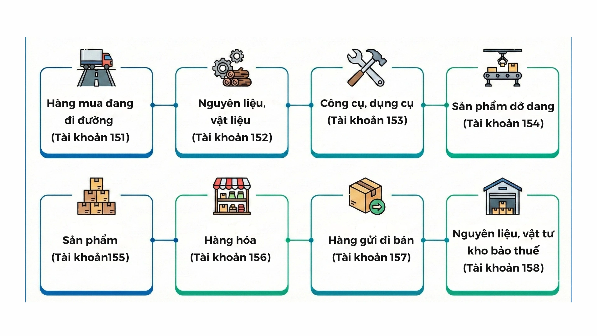 - Tài khoản 151 – Hàng mua đang đi đường dùng để phản ánh giá trị hàng hóa, vật tư doanh nghiệp đã mua nhưng đến cuối kỳ vẫn chưa về nhập kho. Đây là tài khoản giúp kế toán theo dõi quyền sở hữu hàng hóa đã phát sinh nhưng chưa đủ điều kiện ghi nhận vào kho.