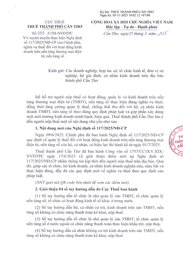 Ngày 04/11/2025, Cục Thuế TP. Cần Thơ ban hành Công văn số 3919/CTH-NVDTPC nhằm tuyên truyền, hướng dẫn thực hiện nghĩa vụ thuế theo Nghị định số 117/2025/NĐ-CP đối với hoạt động kinh doanh trên nền tảng thương mại điện tử, nền tảng số của hộ, cá nhân kinh doanh. Mục tiêu là hỗ trợ người nộp thuế thực hiện đúng quy định, chống thất thu và thúc đẩy môi trường kinh doanh minh bạch, hiệu quả.
