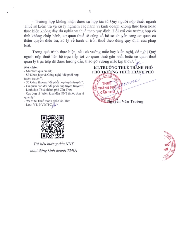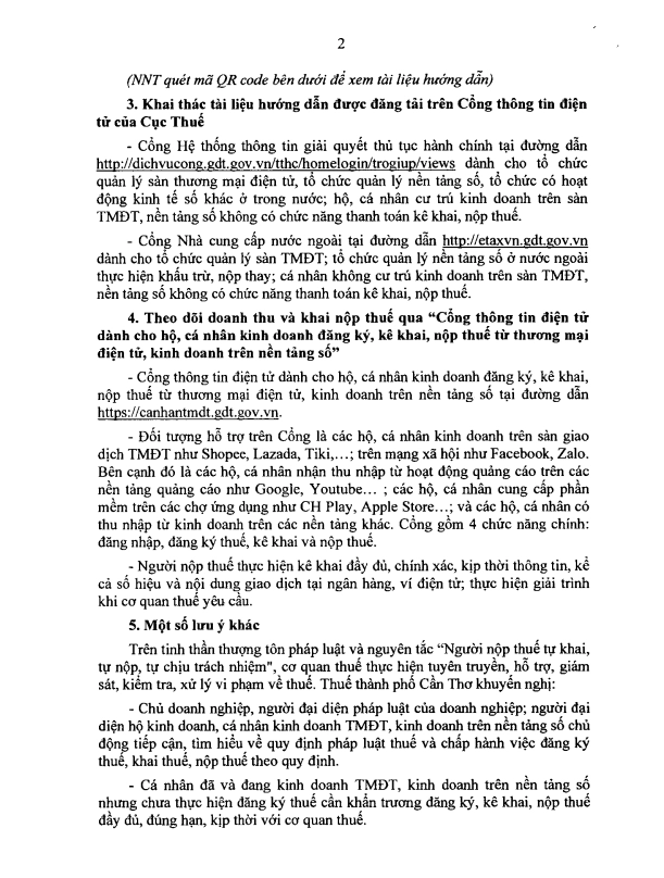 Cục Thuế TP. Cần Thơ kêu gọi cộng đồng doanh nghiệp, tổ chức, hộ kinh doanh, cá nhân kinh doanh trên nền tảng số chủ động tiếp cận thông tin, hợp tác và thực hiện đầy đủ nghĩa vụ thuế để góp phần xây dựng một môi trường kinh doanh công bằng, minh bạch và phát triển bền vững.