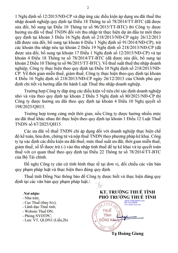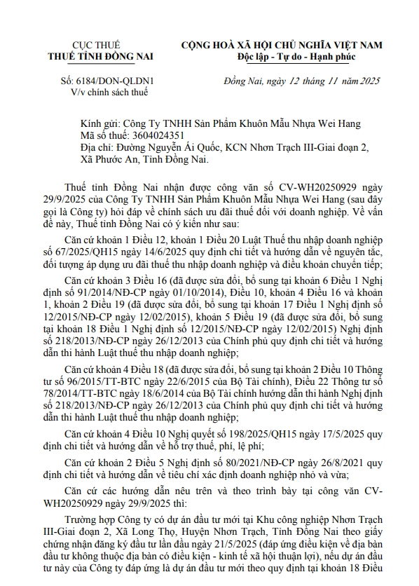 Ngày 12/11/2025 Cục Thuế tỉnh Đồng Nai ban hành công văn số 6184/DON-QLDN1 nhằm trả lời Công ty TNHH Sản Phẩm Khuôn Mẫu Nhựa Wei Hang về chính sách ưu đãi thuế thu nhập doanh nghiệp (TNDN) đối với dự án đầu tư mới tại Khu công nghiệp Nhơn Trạch III – Giai đoạn 2. Cơ quan thuế đã căn cứ các quy định pháp lý hiện hành để xác định điều kiện hưởng ưu đãi, mức thuế suất, và trách nhiệm của doanh nghiệp trong việc kê khai, quyết toán thuế.