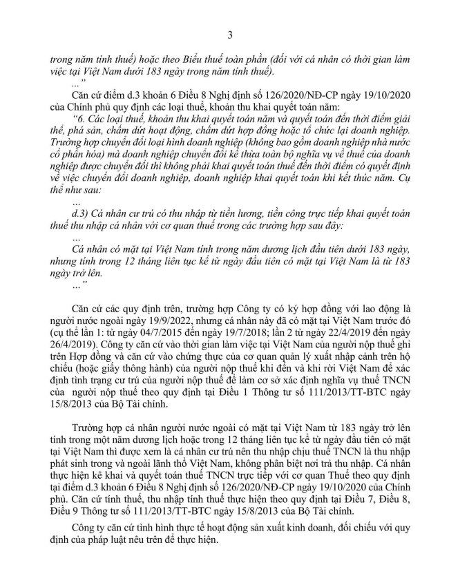 - Trường hợp cá nhân người nước ngoài có mặt tại Việt Nam từ 183 ngày trở lên tính trong một năm dương lịch hoặc trong 12 tháng liên tục kể từ ngày đầu tiên có mặt tại Việt Nam thì được xem là cá nhân cư trú nên thu nhập chịu thuế TNCN là thu nhập phát sinh trong và ngoài lãnh thổ Việt Nam, không phân biệt nơi trả thu nhập. Cá nhân thực hiện kê khai và quyết toán thuế TNCN trực tiếp với cơ quan Thuế theo quy định tại điểm d.3 khoản 6 Điều 8 Nghị định số 126/2020/NĐ-CP ngày 19/10/2020 của Chính phủ. Căn cứ tính thuế, thu nhập tính thuế thực hiện theo quy định tại Điều 7, Điều 8, Điều 9 Thông tư số 111/2013/TT-BTC ngày 15/8/2013 của Bộ Tài chính.