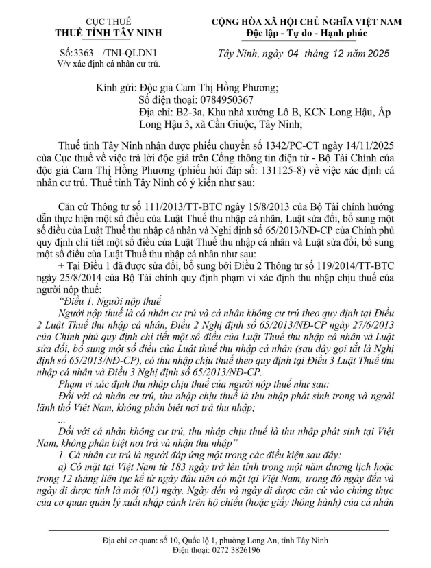 Ngày 04/12/2025, Cục Thuế tỉnh Tây Ninh ban hành Công văn số 3363/TNI-QLDN1 nhằm hướng dẫn cách xác định tình trạng cư trú của cá nhân – đặc biệt là người nước ngoài – để tính thuế thu nhập cá nhân (TNCN) theo đúng quy định pháp luật.