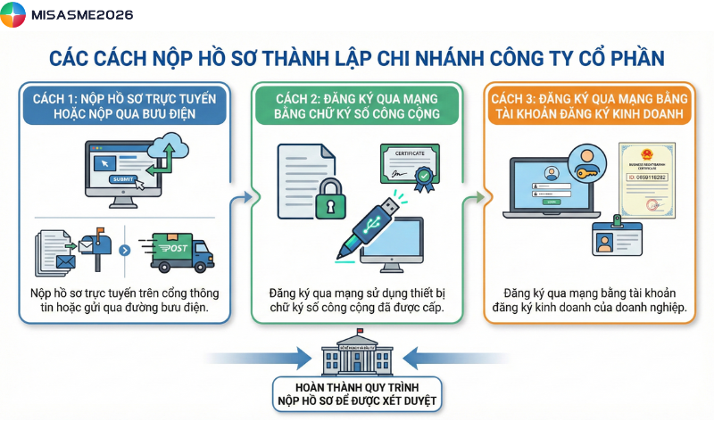 Doanh nghiệp sẽ tiến hành nộp hồ sơ. Tùy theo hình thức, quy trình thành lập chi nhánh công ty cổ phần sẽ có sự khác nhau. Doanh nghiệp có thể lựa chọn một trong những cách sau: