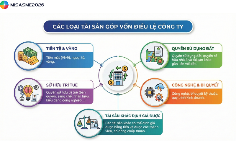 Tài sản góp vốn có thể là tiền mặt, ngoại tệ, quyền sử dụng đất, quyền sở hữu trí tuệ, công nghệ hoặc các tài sản hợp pháp khác theo quy định pháp luật.