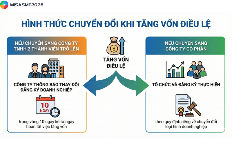 - Nếu chuyển sang công ty TNHH 2 thành viên trở lên: Công ty thông báo thay đổi đăng ký doanh nghiệp trong vòng 10 ngày kể từ ngày hoàn tất việc tăng vốn