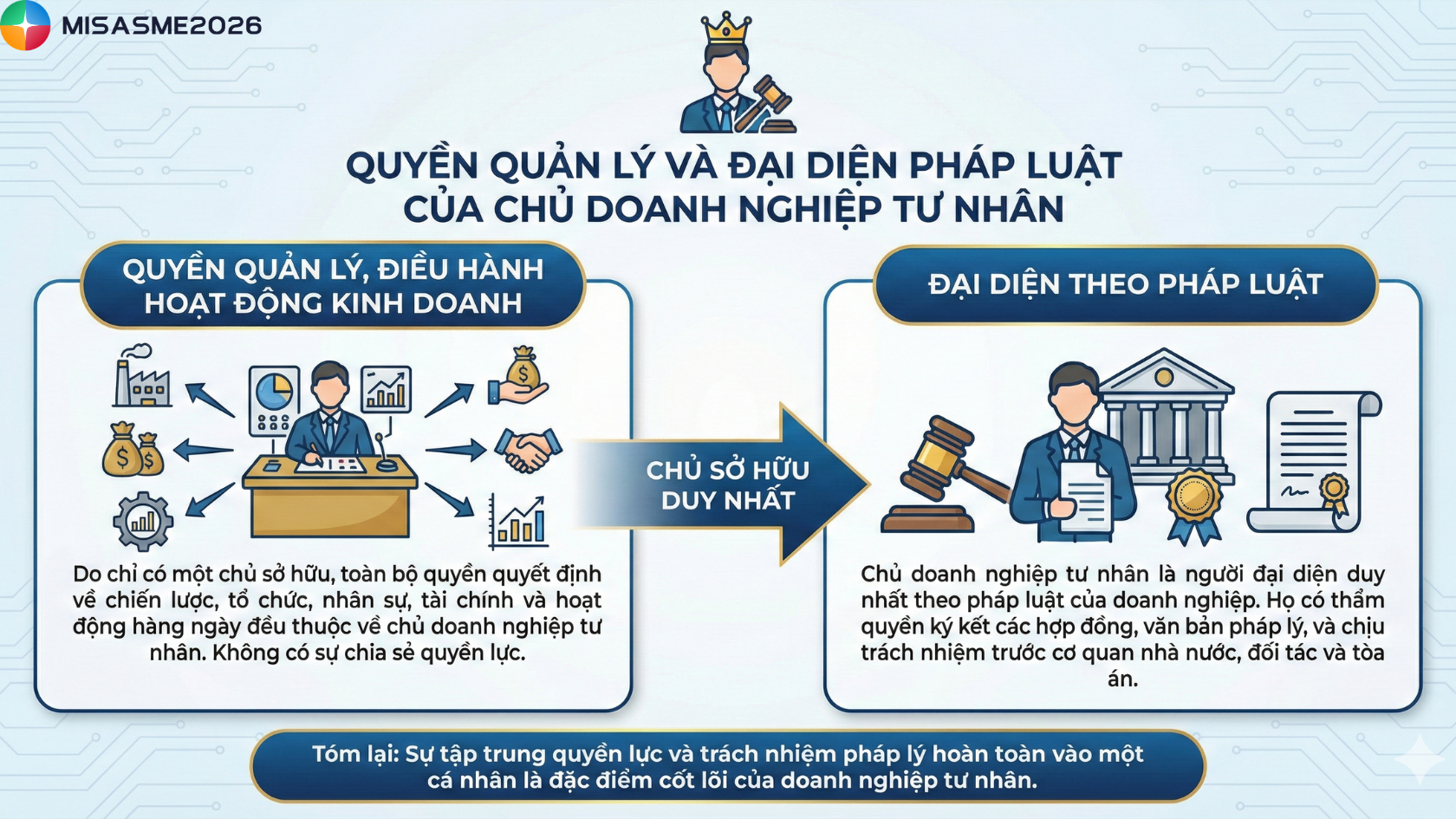 Do chỉ có một chủ sở hữu nên toàn bộ quyền quản lý, điều hành hoạt động kinh doanh đều do chủ doanh nghiệp tư nhân quyết định. Đồng thời, chủ doanh nghiệp cũng là người đại diện theo pháp luật của doanh nghiệp.