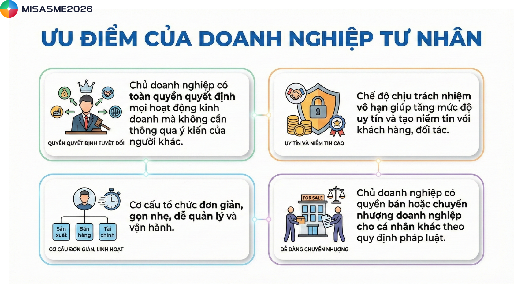 Doanh nghiệp tư nhân là một trong những loại hình doanh nghiệp phổ biến tại Việt Nam, đặc biệt phù hợp với cá nhân muốn tự chủ trong hoạt động kinh doanh. Tuy nhiên, trước khi lựa chọn mô hình này, bạn cần hiểu rõ đặc điểm pháp lý, ưu nhược điểm cũng như thủ tục thành lập doanh nghiệp tư nhân theo quy định hiện hành. Bài viết dưới đây của phần mềm kế toán MISA SME sẽ giúp bạn nắm tổng quan các thông tin quan trọng liên quan đến doanh nghiệp tư nhân.