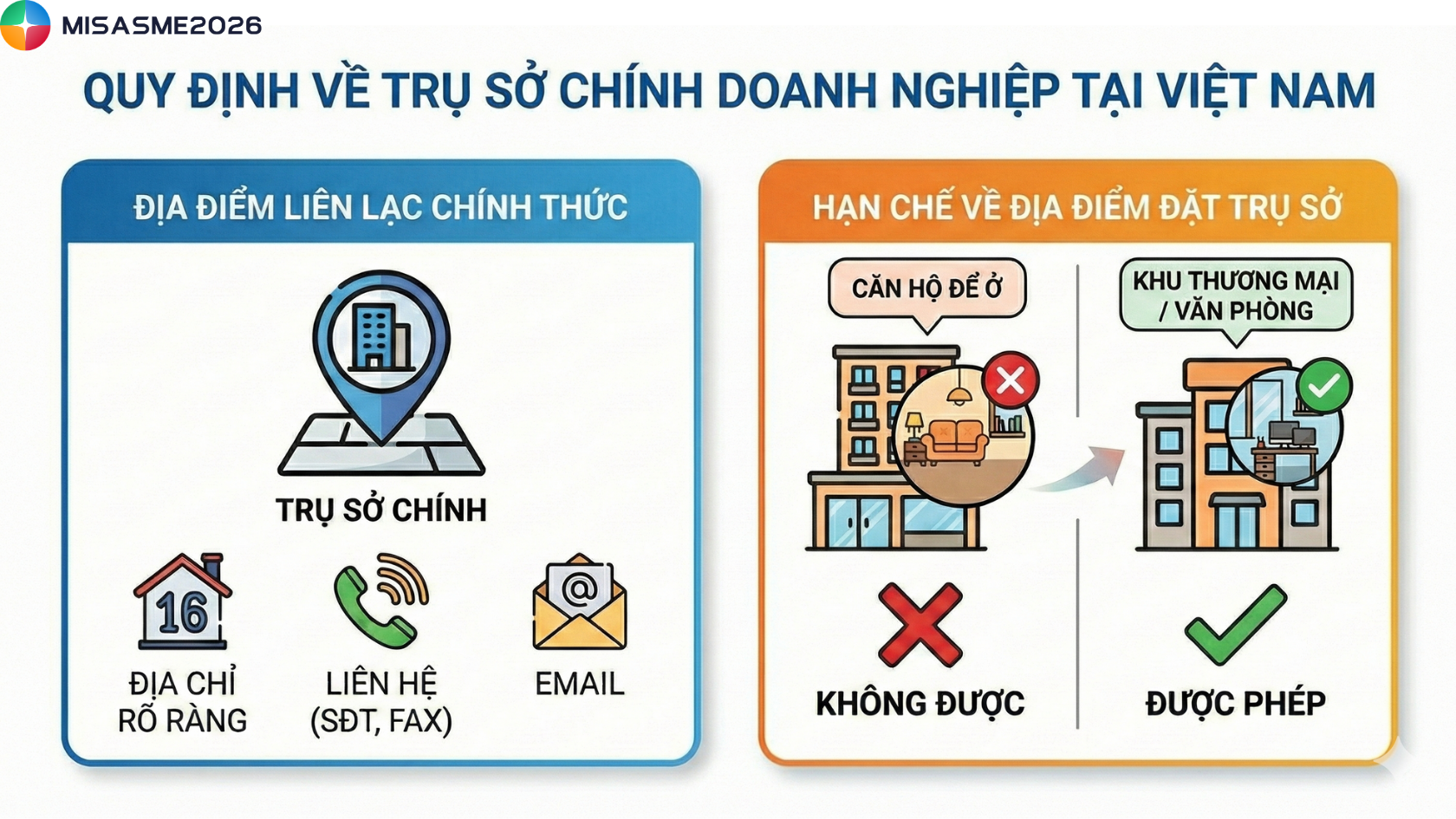 Trụ sở chính là địa điểm liên lạc chính thức của doanh nghiệp trên lãnh thổ Việt Nam. Địa chỉ trụ sở phải xác định rõ thông tin như số nhà, đường, phường/xã, quận/huyện, tỉnh/thành phố, kèm theo số điện thoại, fax và email (nếu có).