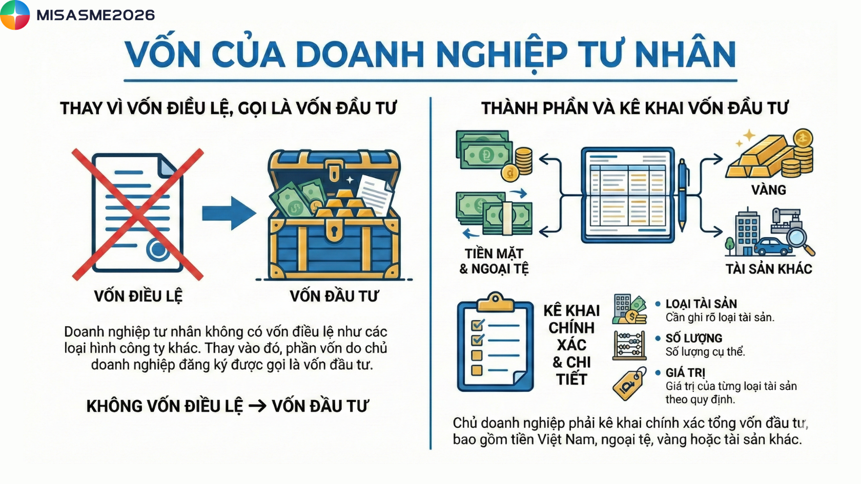 Doanh nghiệp tư nhân không có vốn điều lệ như các loại hình công ty khác. Thay vào đó, phần vốn do chủ doanh nghiệp đăng ký được gọi là vốn đầu tư.