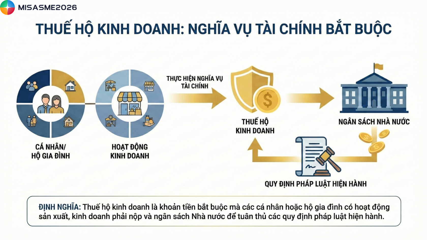 Thuế hộ kinh doanh là nghĩa vụ tài chính bắt buộc mà cá nhân hoặc hộ gia đình có hoạt động sản xuất, kinh doanh phải thực hiện với ngân sách Nhà nước theo quy định của pháp luật hiện hành.