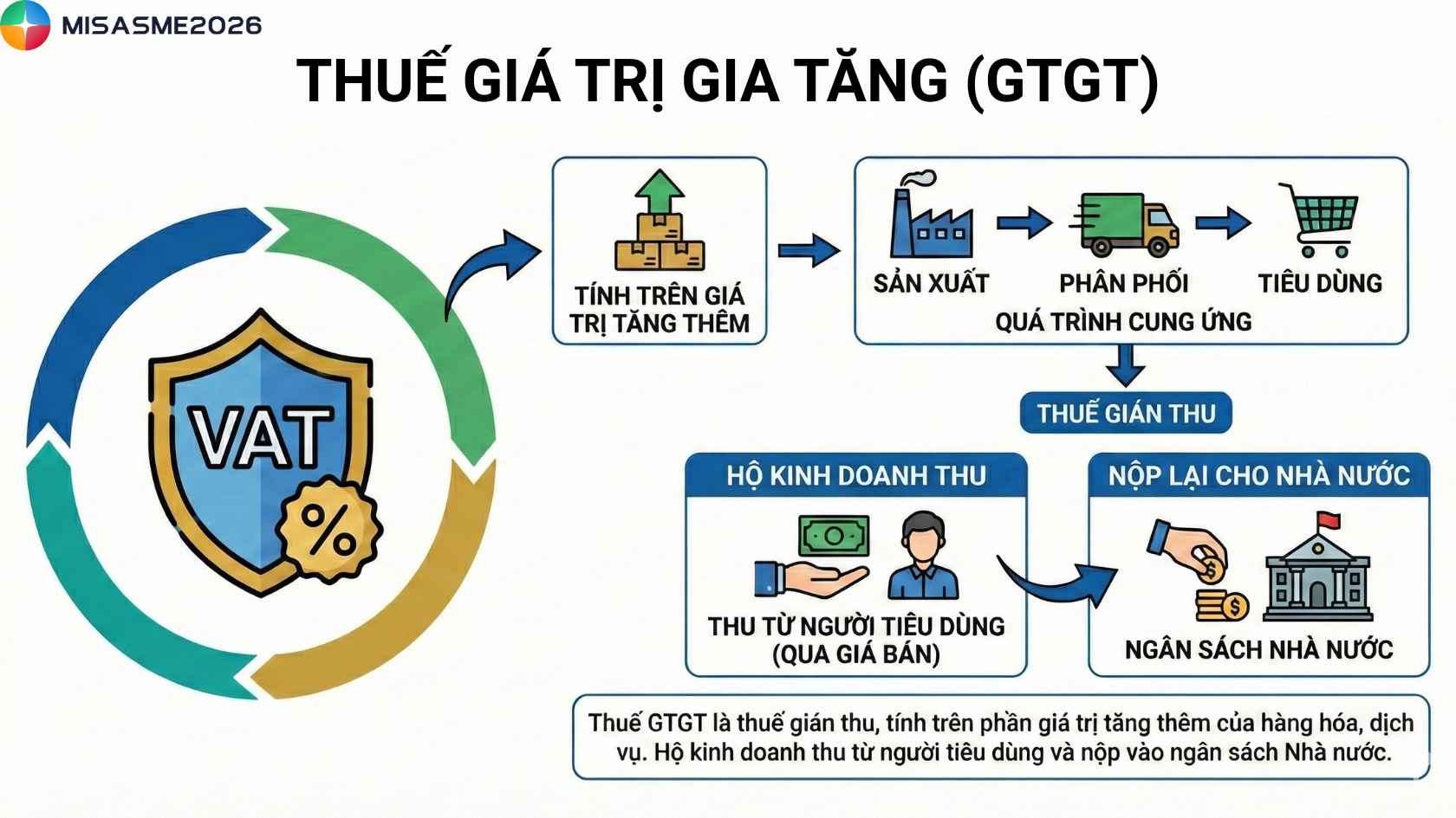 Thuế giá trị gia tăng là khoản thuế được tính trên phần giá trị tăng thêm của hàng hóa, dịch vụ trong quá trình cung ứng ra thị trường. Đây là loại thuế gián thu, theo đó hộ kinh doanh thực hiện thu từ người tiêu dùng thông qua giá bán và nộp lại cho Nhà nước.