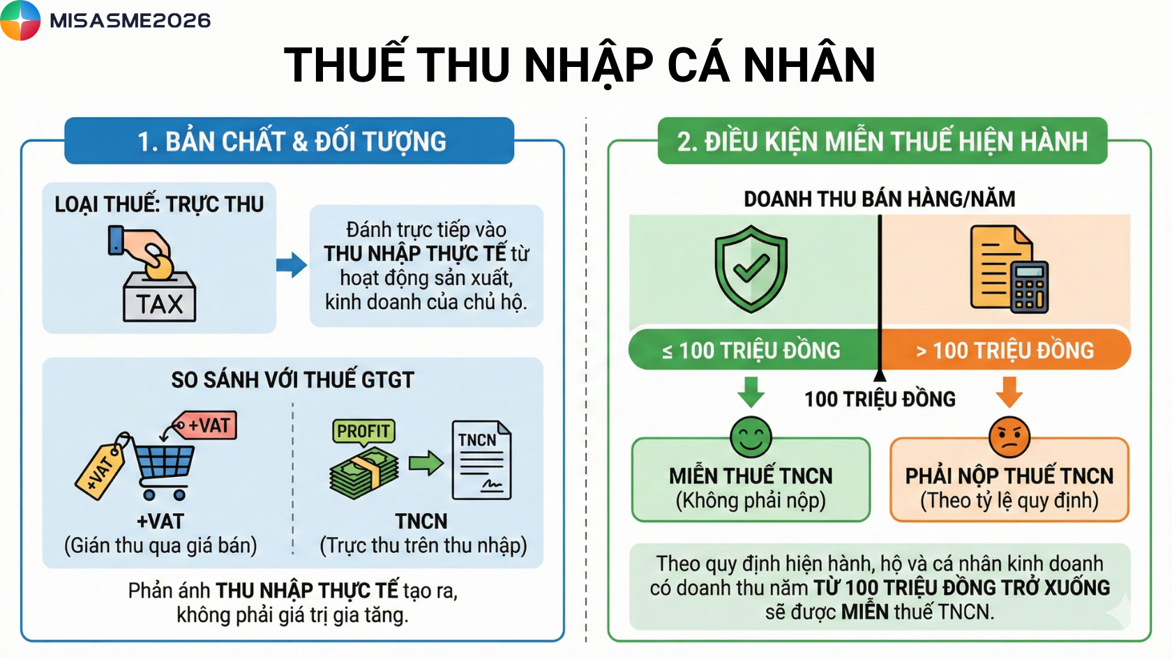 Thuế thu nhập cá nhân là khoản thuế trực thu, được tính trên thu nhập từ hoạt động sản xuất, kinh doanh của chủ hộ. Khác với thuế GTGT, thuế TNCN phản ánh phần thu nhập thực tế mà hộ kinh doanh tạo ra trong năm.