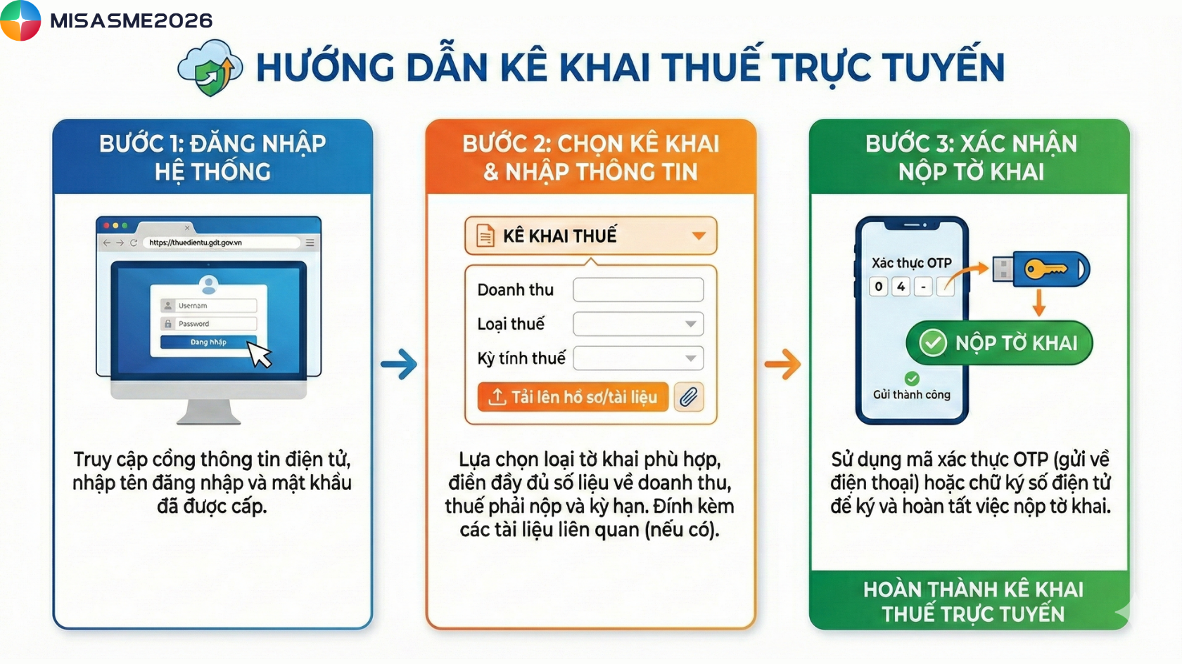 Hộ kinh doanh có thể nộp tờ khai thuế thông qua eTax Mobile hoặc Cổng thông tin điện tử của cơ quan thuế. Quy trình kê khai được chuẩn hóa gồm 03 bước cơ bản: