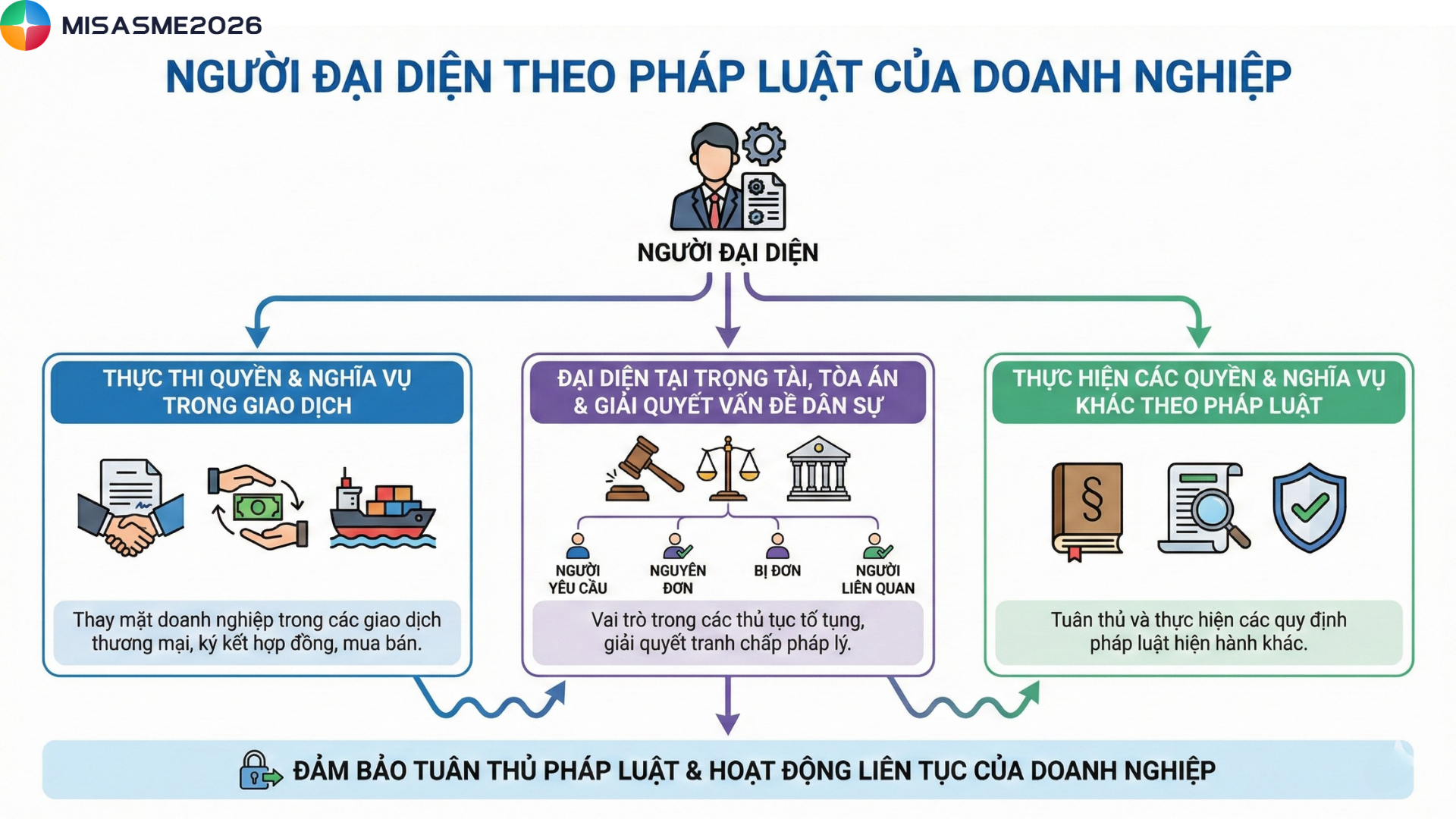 Người đại diện theo pháp luật của doanh nghiệp là cá nhân thay mặt doanh nghiệp để thực thi các quyền hạn và nghĩa vụ phát sinh trong các giao dịch. Đồng thời, người này còn đại diện cho doanh nghiệp với vai trò là người yêu cầu giải quyết các vấn đề dân sự, nguyên đơn, bị đơn, hoặc người có quyền lợi và nghĩa vụ liên quan tại Trọng tài, Tòa án, cũng như thực hiện các quyền và nghĩa vụ khác theo quy định pháp luật hiện hành.