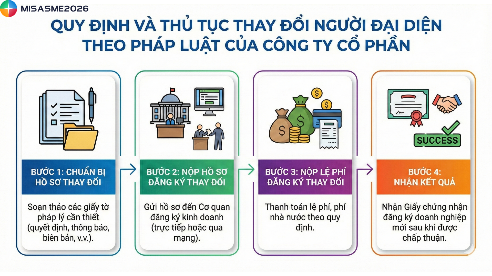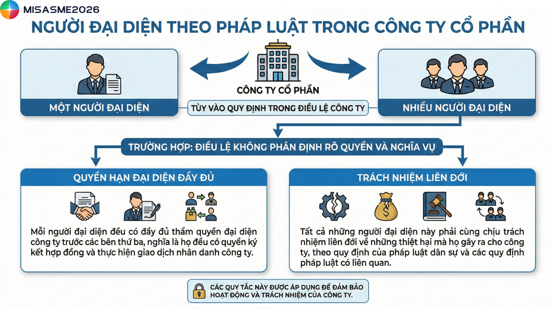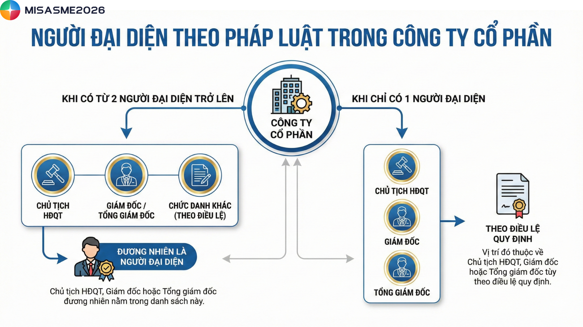 Người đại diện theo pháp luật của công ty cổ phần giữ vai trò trung tâm trong việc đại diện, điều hành và chịu trách nhiệm pháp lý cho mọi hoạt động của doanh nghiệp. Việc hiểu đúng quy định về chức danh này giúp công ty cổ phần lựa chọn nhân sự phù hợp, phân định rõ quyền – nghĩa vụ và hạn chế rủi ro pháp lý trong quá trình hoạt động. Bài viết dưới đây của phần mềm kế toán MISA SME sẽ làm rõ các quy định quan trọng liên quan đến người đại diện theo pháp luật theo pháp luật hiện hành.