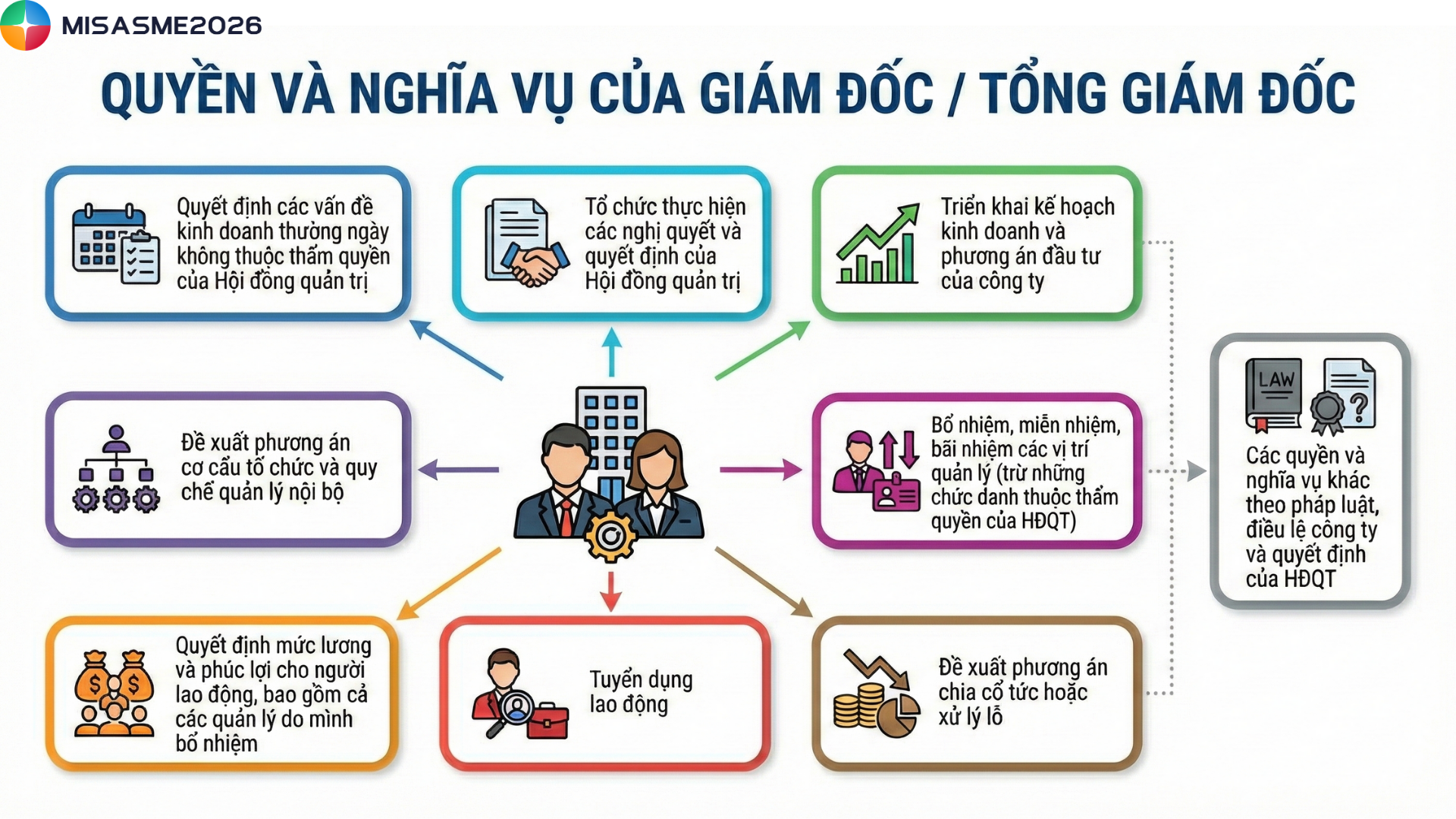 Quyền và nghĩa vụ của người đại diện theo pháp luật được xác định dựa trên chức danh cụ thể mà họ đang đảm nhận trong công ty. Nếu là Giám đốc hoặc Tổng giám đốc, họ có các quyền và nghĩa vụ sau: