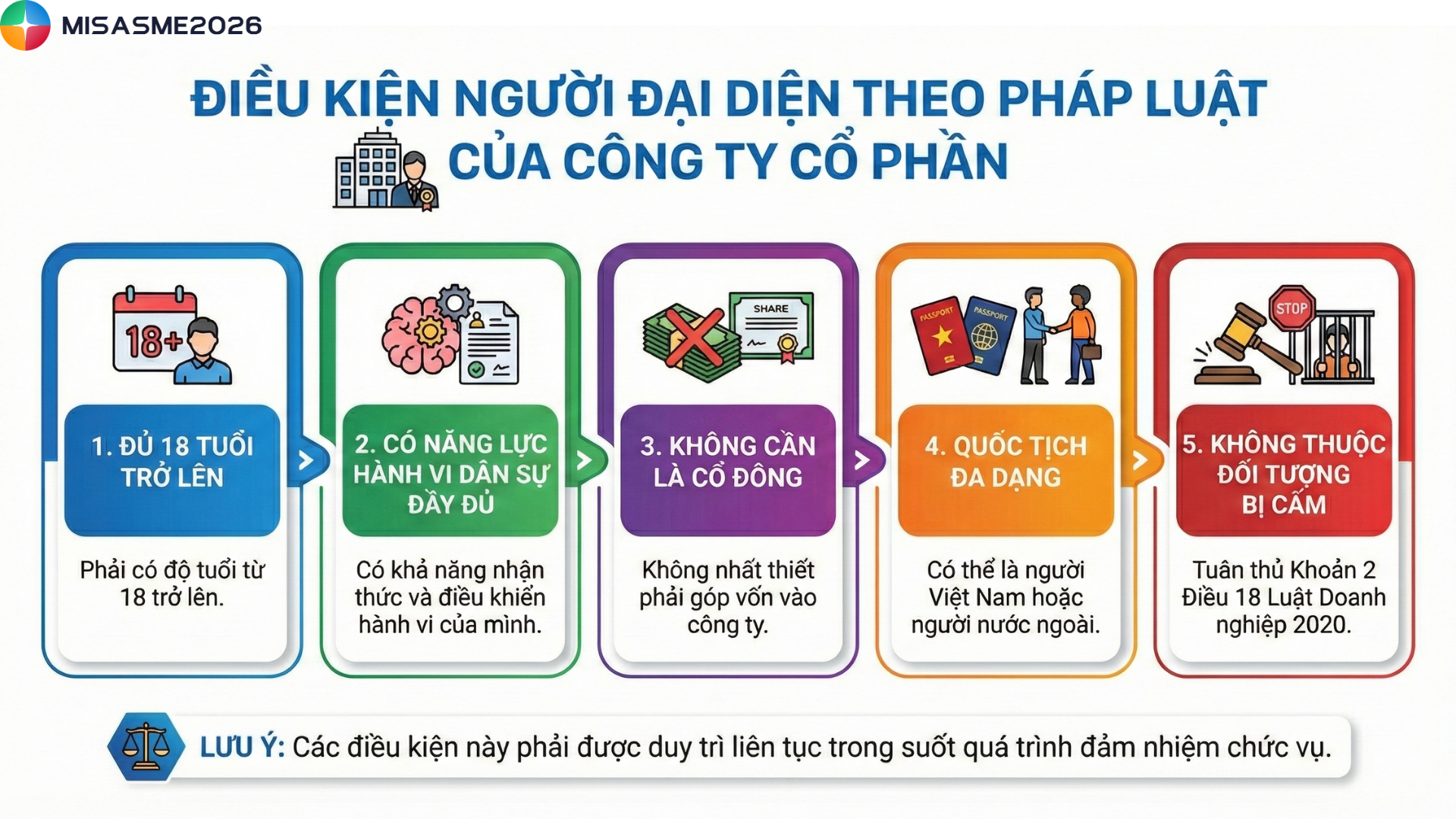 Để được bổ nhiệm làm người đại diện theo pháp luật của công ty cổ phần, cá nhân cần đáp ứng đầy đủ các điều kiện sau: