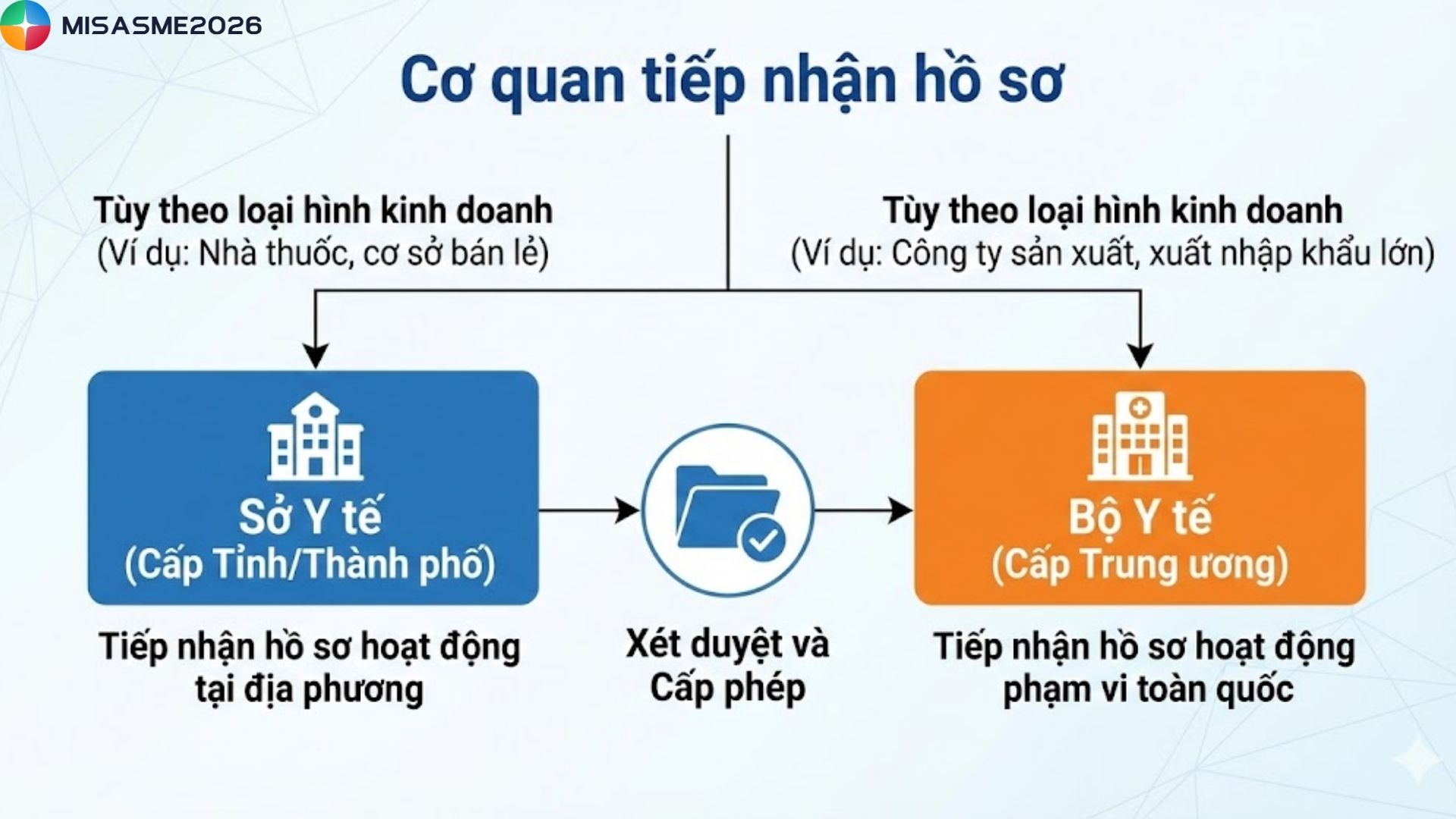 Cơ quan tiếp nhận hồ sơ: Tùy theo loại hình kinh doanh, hồ sơ sẽ nộp tại Sở Y tế hoặc Bộ Y tế.