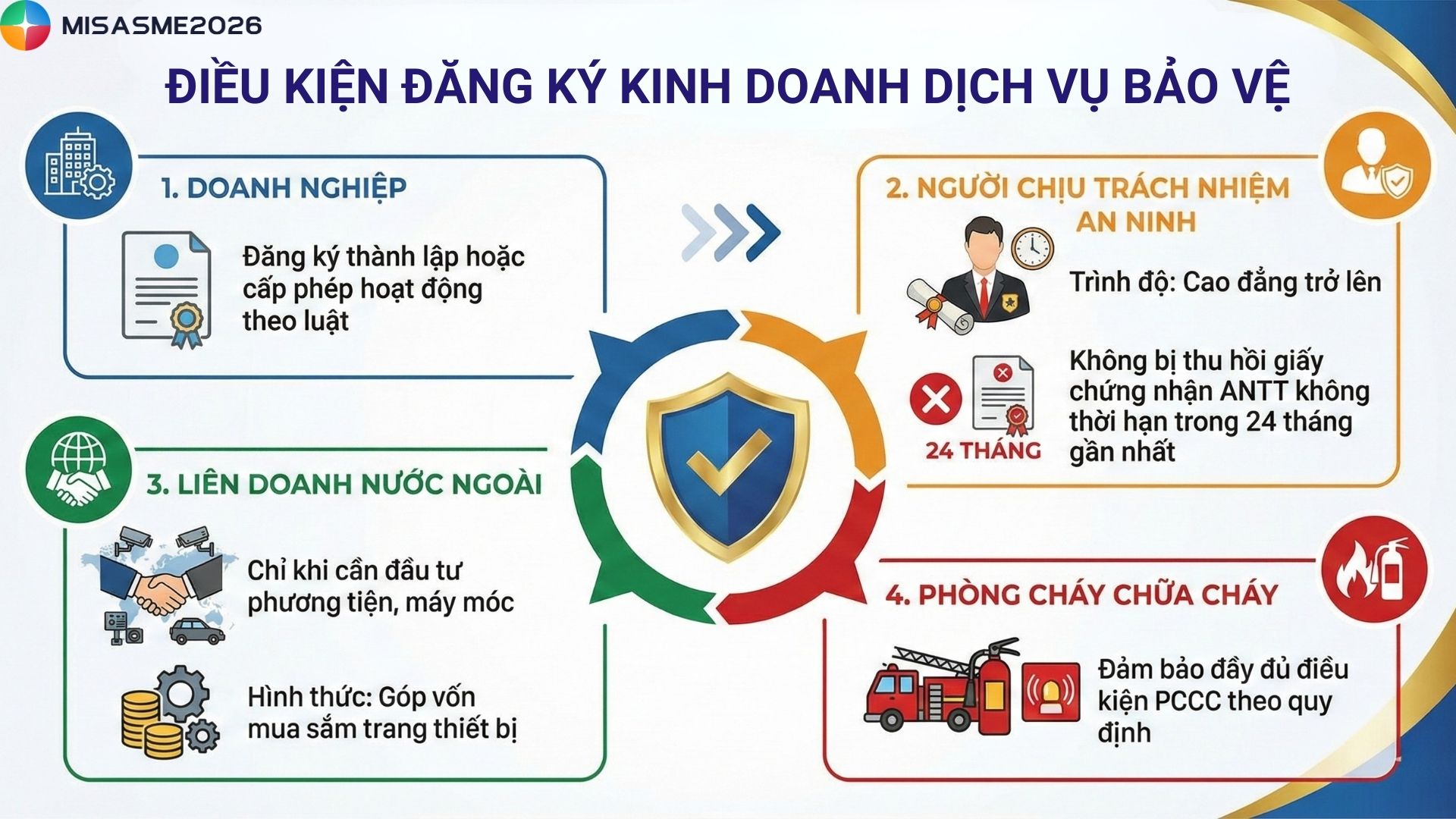 Việc thành lập công ty bảo vệ không chỉ đơn thuần là đăng ký doanh nghiệp mà còn phải đáp ứng thêm các điều kiện pháp lý và xin giấy phép con bắt buộc. Cụ thể, doanh nghiệp cần thực hiện đăng ký kinh doanh và hoàn tất thủ tục xin Giấy chứng nhận đủ điều kiện về an ninh, trật tự trước khi đi vào hoạt động. Trong bài viết này của phần mềm kế toán MISA SME, bạn sẽ được hướng dẫn chi tiết từ mã ngành, điều kiện, hồ sơ đến quy trình thành lập công ty bảo vệ đúng quy định.