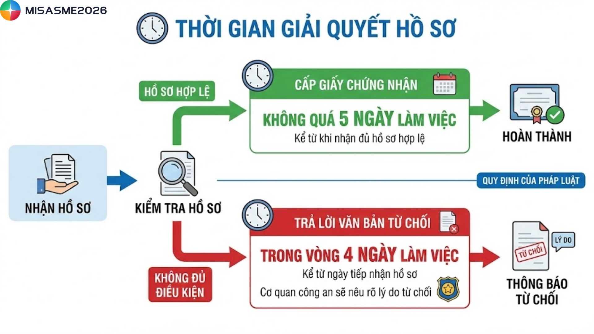 Thời gian cấp Giấy chứng nhận: không quá 5 ngày làm việc kể từ khi nhận đủ hồ sơ hợp lệ