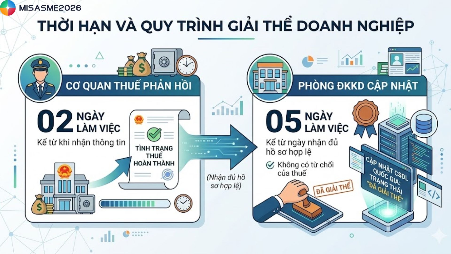Trong 05 ngày làm việc kể từ ngày nhận đủ hồ sơ hợp lệ, nếu không có ý kiến từ chối của Cơ quan thuế, Phòng Đăng ký kinh doanh sẽ cập nhật tình trạng pháp lý của doanh nghiệp trên Cơ sở dữ liệu quốc gia sang trạng thái “đã giải thể”.