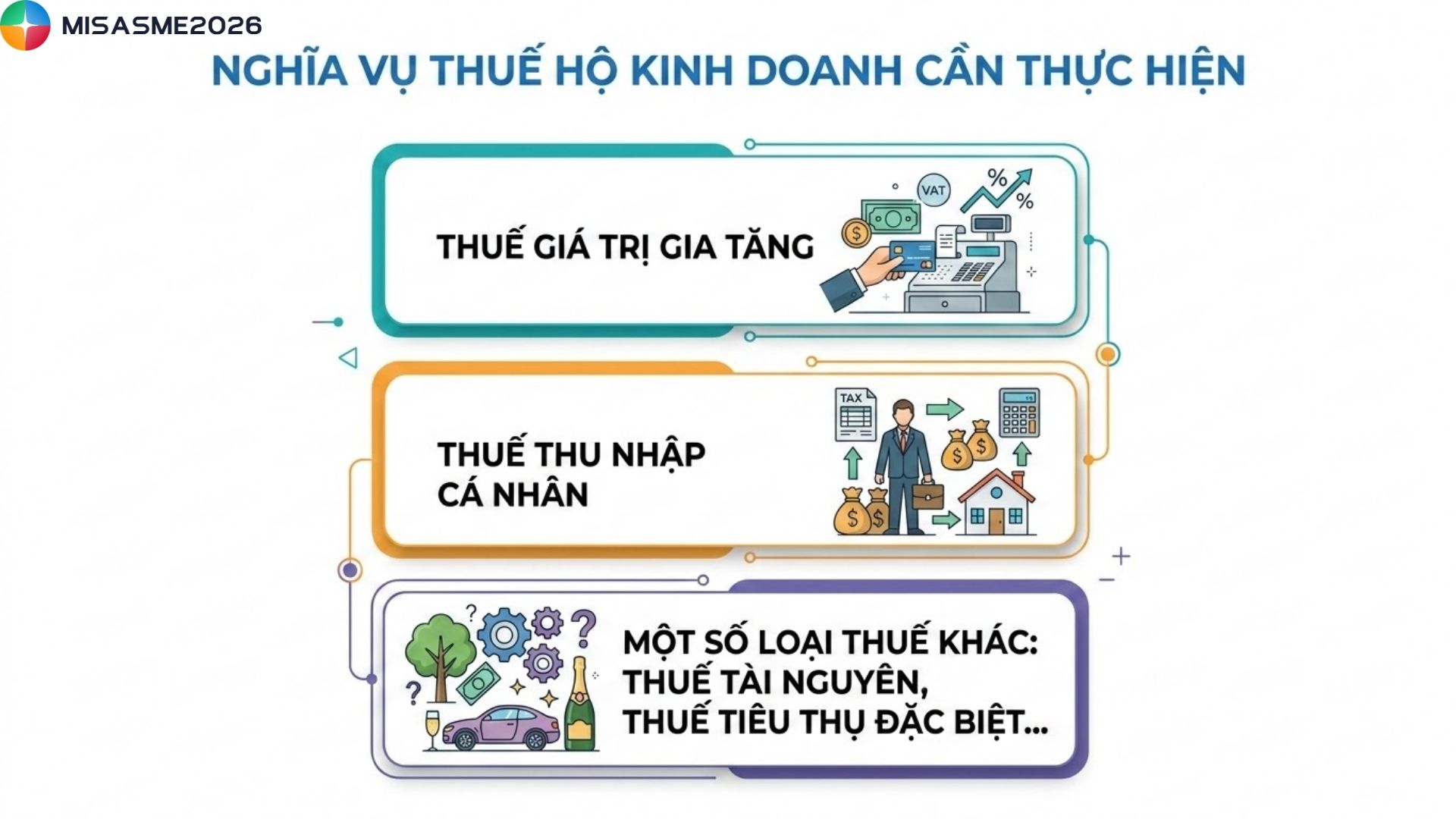 Theo quy định, hộ kinh doanh cần thực hiện các nghĩa vụ cho các loại thuế: