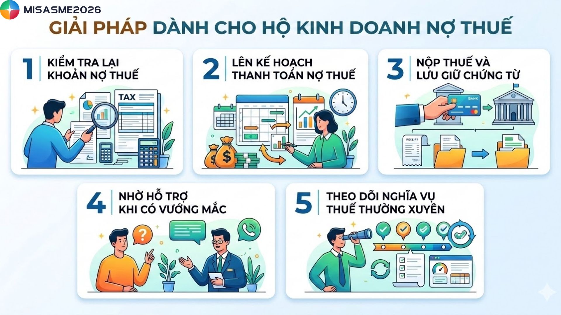 Khi phát hiện còn nợ thuế, hộ kinh doanh nên xử lý sớm để tránh phát sinh tiền phạt và các rủi ro pháp lý. Để giải quyết đúng quy định, chủ hộ có thể thực hiện theo các bước sau: