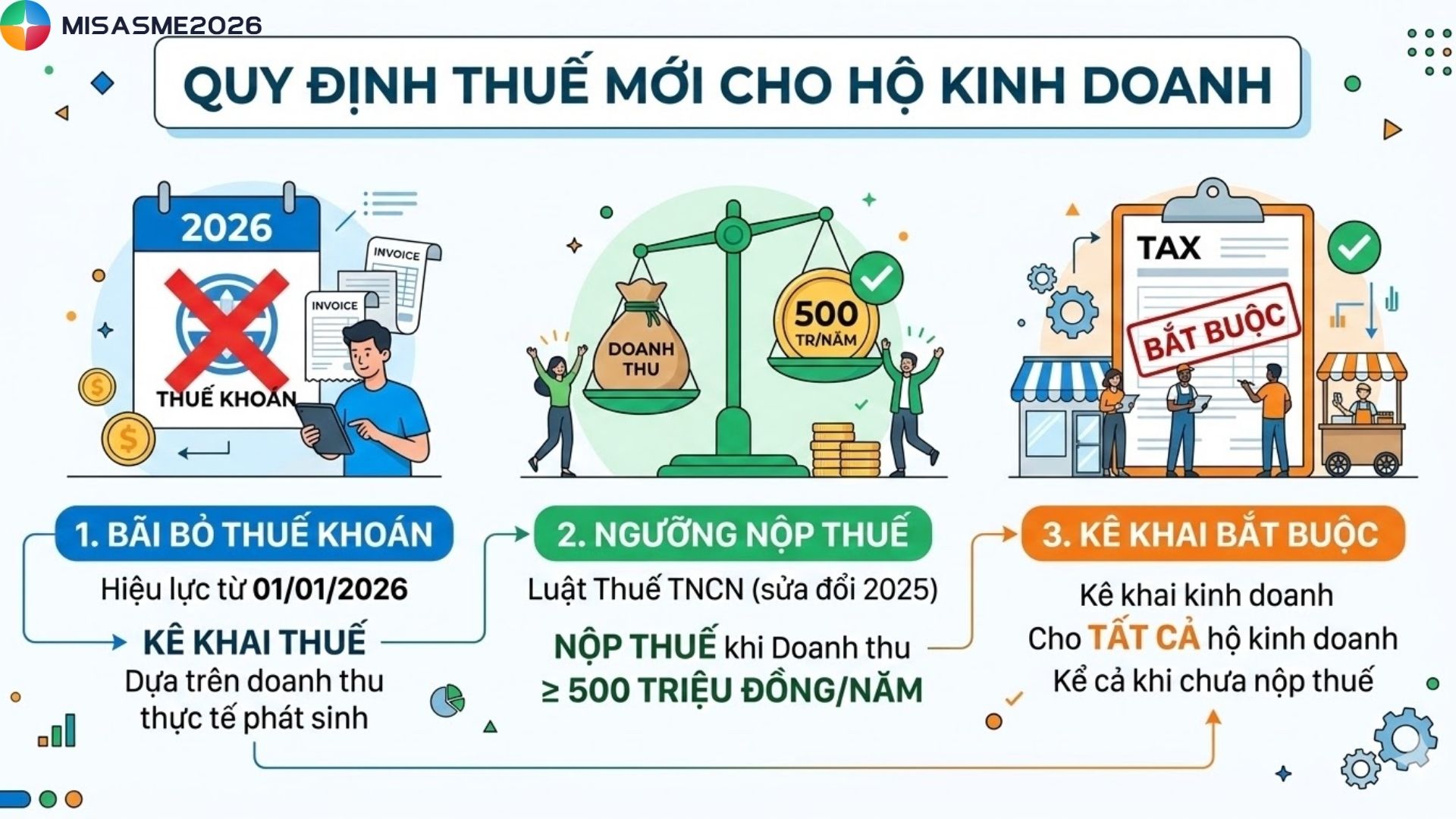 Từ năm 2026, chính sách thuế đối với hộ kinh doanh có nhiều thay đổi, đặc biệt là việc chuyển sang phương thức kê khai thuế hộ kinh doanh theo doanh thu thực tế. Điều này khiến nhiều chủ hộ chưa rõ cần chuẩn bị hồ sơ gì và quy trình thực hiện ra sao. Nếu bạn đang tìm hiểu kê khai thuế hộ kinh doanh đúng quy định, hãy cùng theo dõi bài viết dưới đây của phần mềm kế toán MISA SME để nắm rõ hướng dẫn chi tiết.