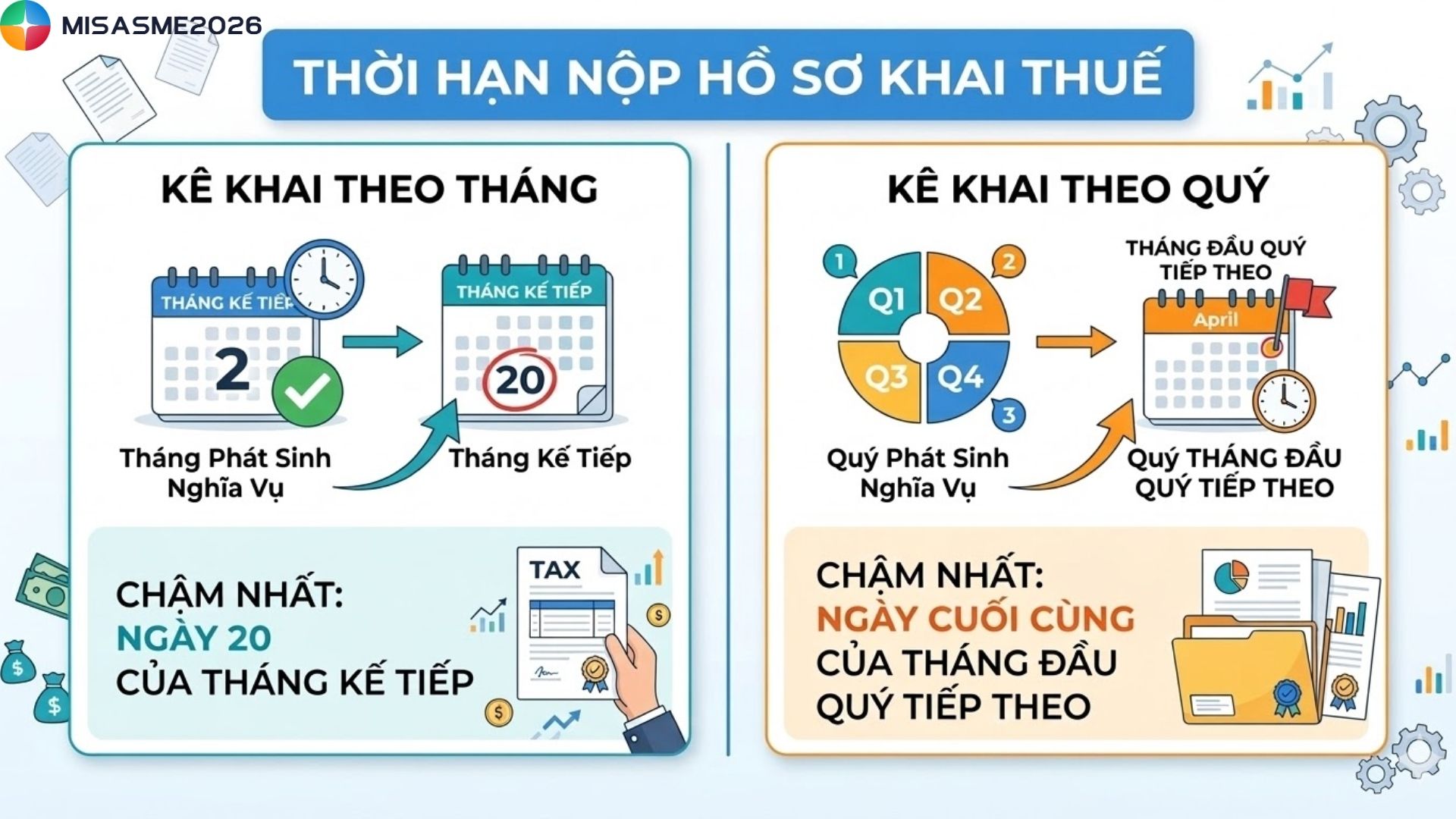 | Khai thuế TNCN | Khai theo quý và quyết toán năm (trước ngày 31/01 năm sau) | Khai theo quý và quyết toán năm | Khai theo quý và quyết toán năm | |
