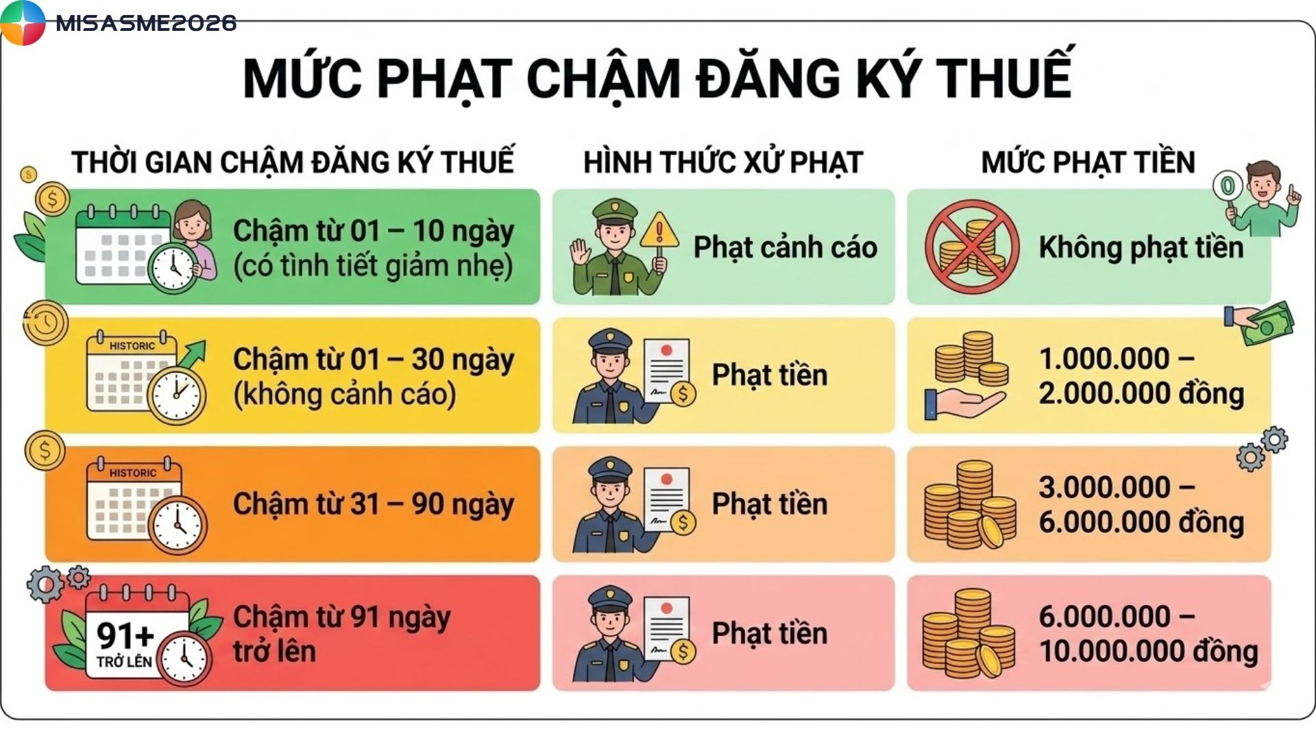 • Mức phạt cụ thể do cơ quan thuế quyết định tùy theo mức độ vi phạm và tình tiết giảm nhẹ/tăng nặng