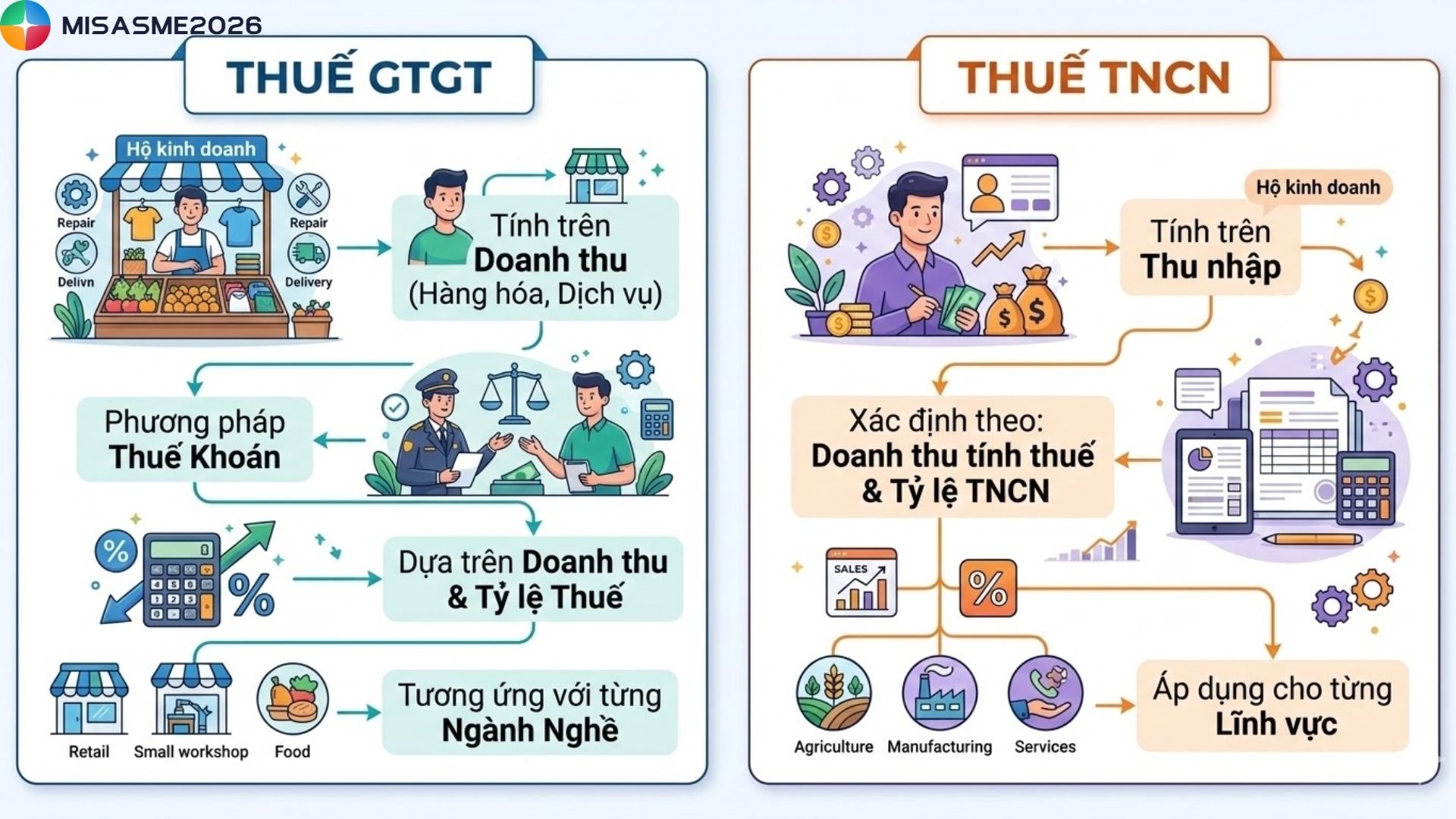 • Thuế GTGT: Là loại thuế tính trên doanh thu từ hoạt động kinh doanh hàng hóa, dịch vụ của hộ kinh doanh. Thuế GTGT thường được cơ quan thuế xác định theo phương pháp thuế khoán, dựa trên doanh thu và tỷ lệ thuế tương ứng với từng ngành nghề.