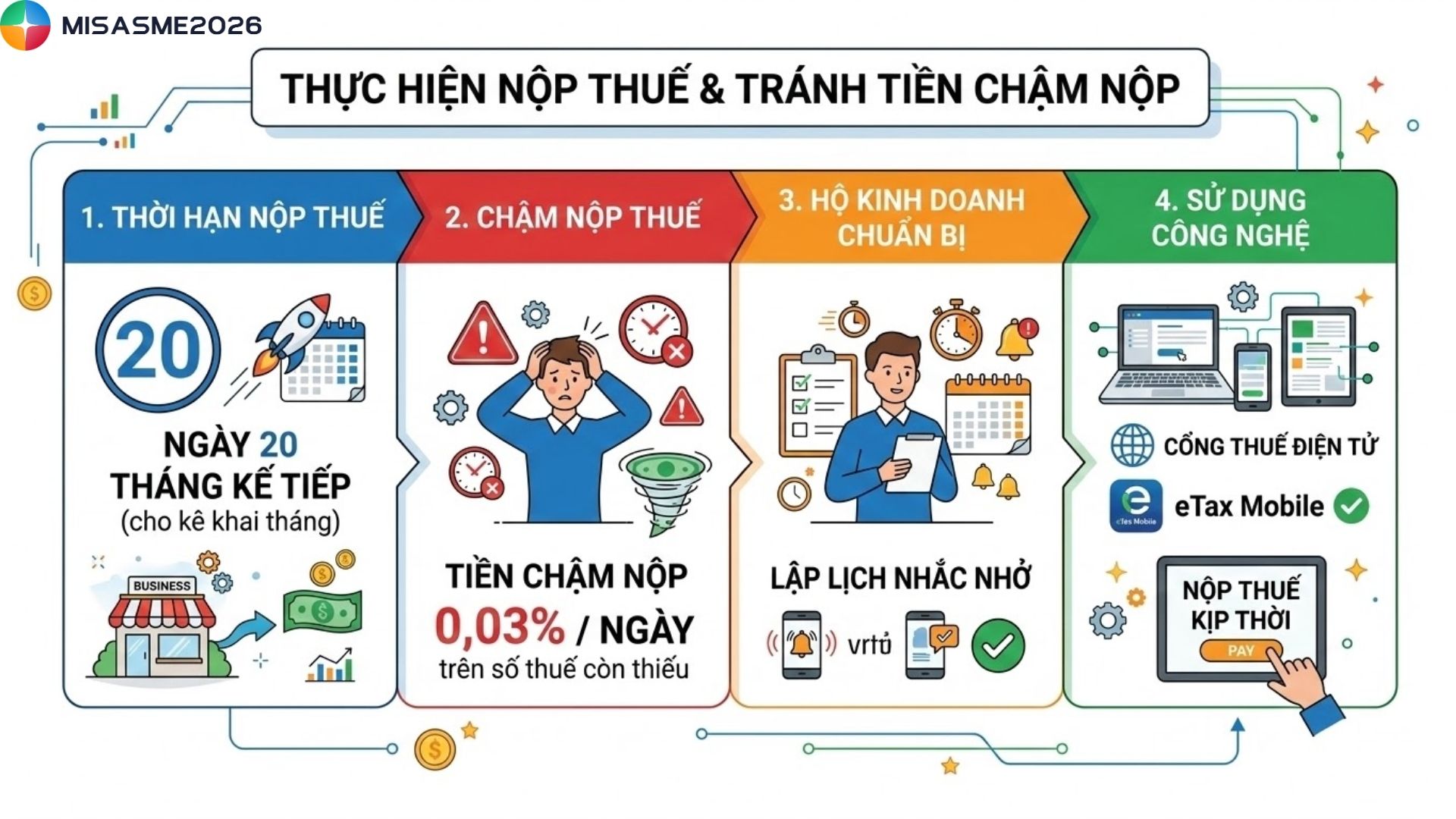 Thực hiện nộp thuế đúng thời hạn theo quy định (thường là ngày 20 của tháng tiếp theo đối với kê khai theo tháng). Nếu nộp chậm sẽ bị tính tiền chậm nộp 0,03%/ngày trên số thuế còn thiếu. Hộ kinh doanh nên lập lịch nhắc và sử dụng Cổng Thuế điện tử hoặc eTax Mobile để nộp thuế kịp thời.
