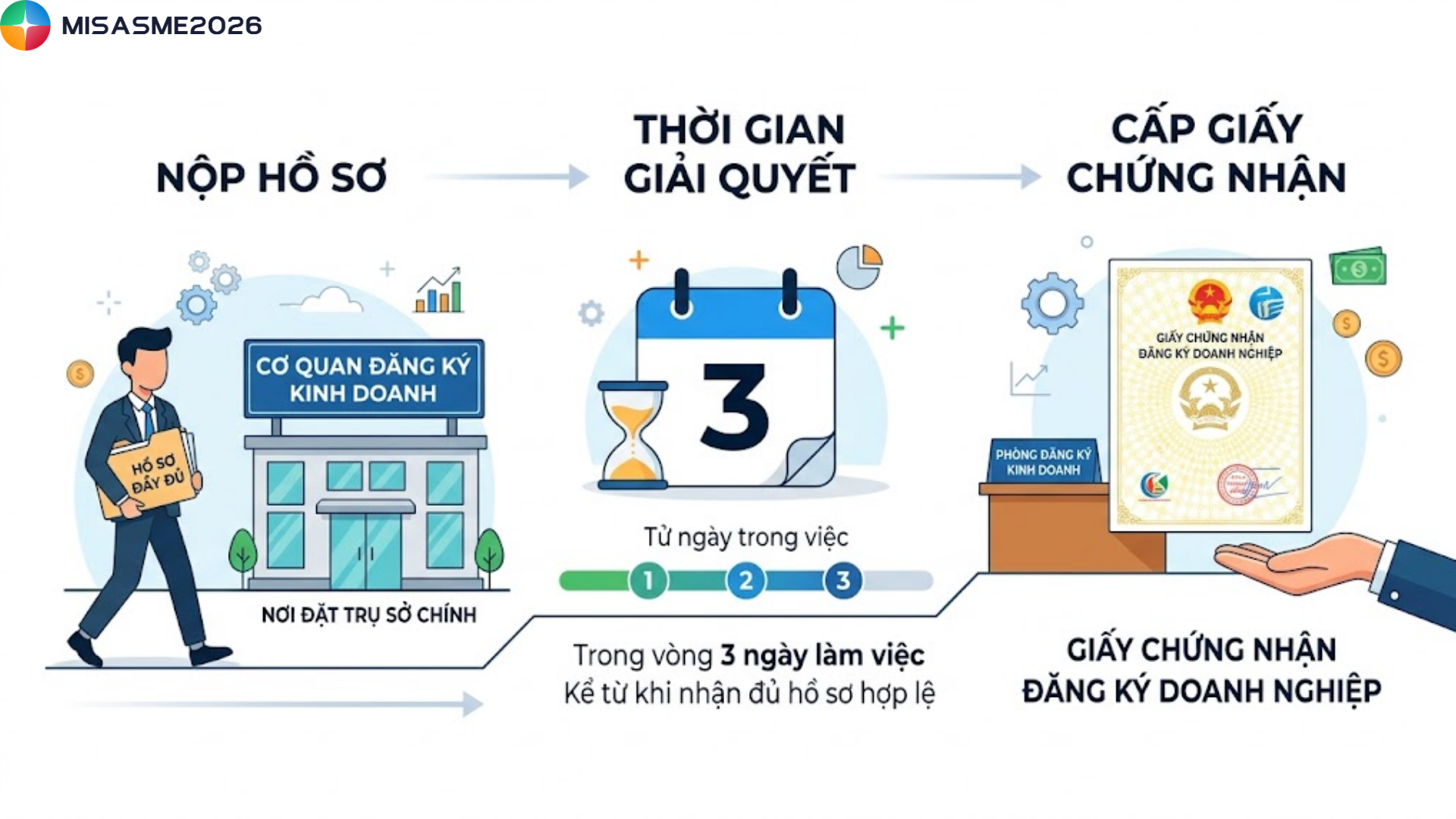Hồ sơ chuẩn bị đầy đủ sẽ được nộp đến Cơ quan đăng ký kinh doanh nơi doanh nghiệp hợp nhất trụ sở chính. Thời gian giải quyết trong vòng 3 ngày làm việc kể từ khi nhận đủ hồ sơ hợp lệ. Phòng Đăng ký kinh doanh sẽ cấp Giấy chứng nhận đăng ký doanh nghiệp.