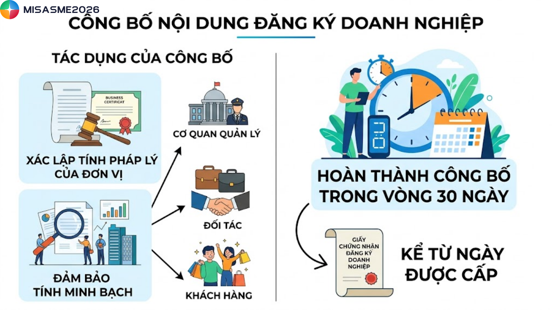 Việc công bố nội dung đăng ký doanh nghiệp có tác dụng giúp xác lập tính pháp lý của đơn vị, đồng thời đảm bảo tính minh bạch đối với cơ quan quản lý, đối tác và khách hàng. Chính vì vậy, chủ doanh nghiệp cần phải hoàn thành công bố trong vòng 30 ngày kể từ ngày được cấp Giấy chứng nhận đăng ký doanh nghiệp.