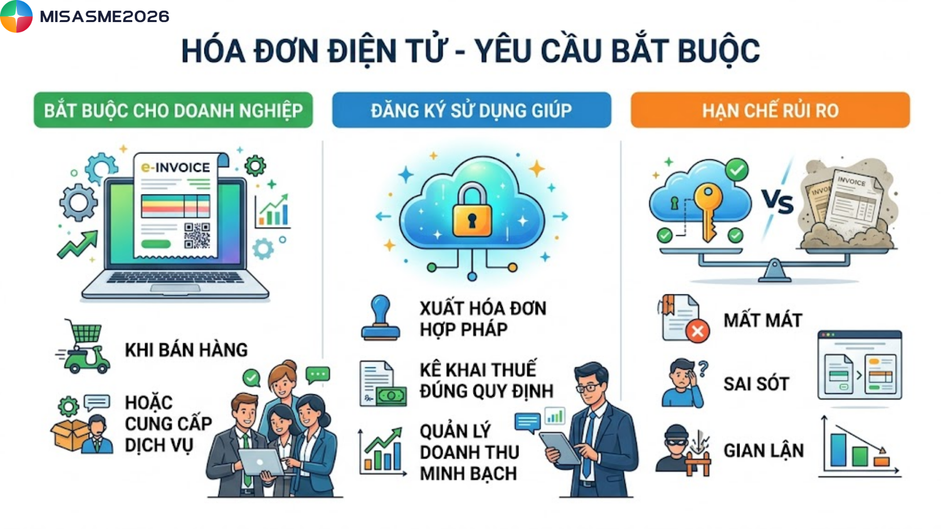Hóa đơn điện tử là yêu cầu bắt buộc đối với doanh nghiệp khi phát sinh hoạt động bán hàng hoặc cung cấp dịch vụ. Việc đăng ký sử dụng hóa đơn điện tử giúp doanh nghiệp xuất hóa đơn hợp pháp, kê khai thuế đúng quy định và quản lý doanh thu minh bạch. Đồng thời, hình thức này cũng hạn chế rủi ro mất mát, sai sót hoặc gian lận so với hóa đơn truyền thống.