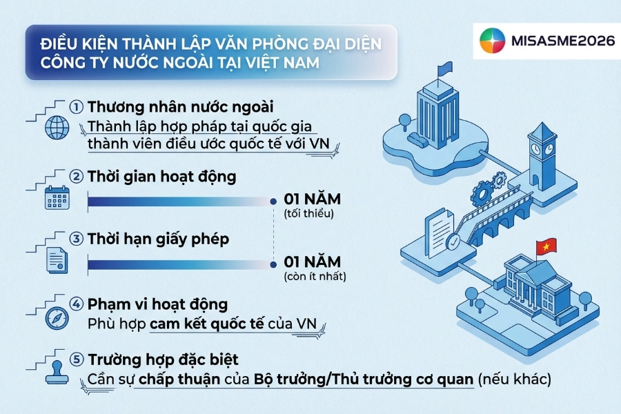 Bài viết dưới đây sẽ cung cấp hướng dẫn chi tiết về thành lập văn phòng đại diện công ty nước ngoài, bao gồm: điều kiện cần đáp ứng, hồ sơ pháp lý, quy trình thực hiện, thẩm quyền cấp phép cũng như những lưu ý quan trọng giúp doanh nghiệp triển khai hiệu quả và đúng quy định.