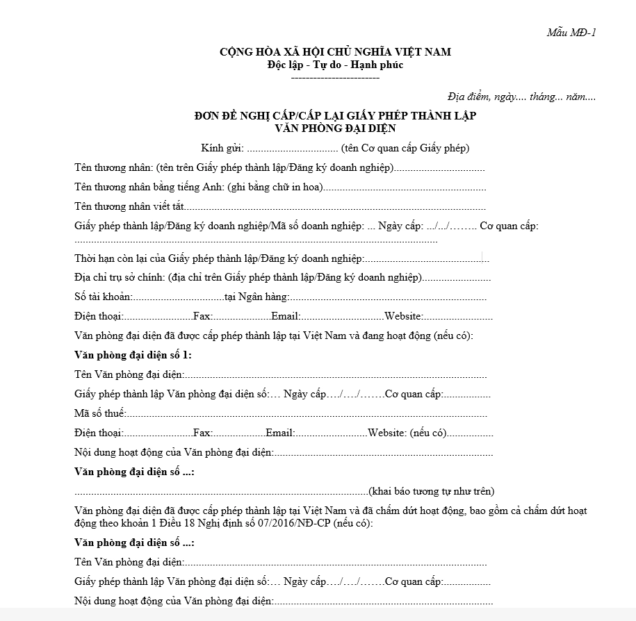 Đơn đề nghị cấp Giấy phép thành lập Văn phòng đại diện của thương nhân nước ngoài tại Việt Nam được lập theo Mẫu MĐ-1, quy định tại Phụ lục ban hành kèm theo Thông tư 11/2016/TT-BCT.