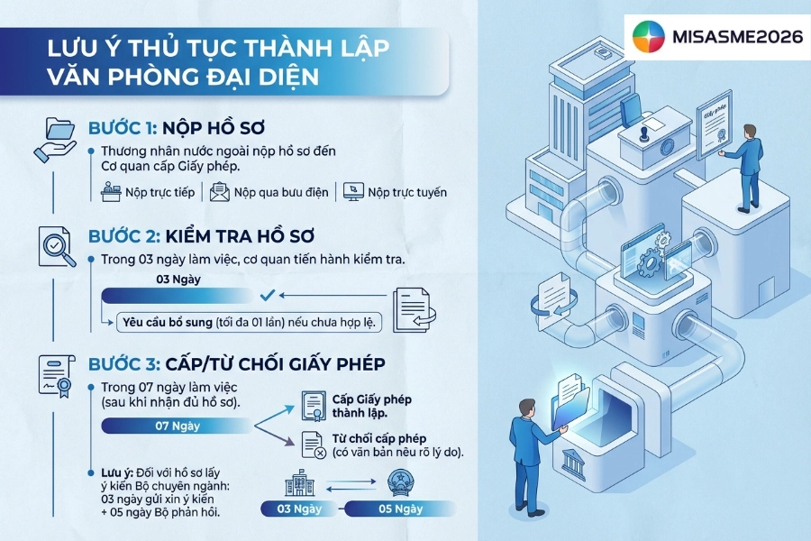 Doanh nghiệp cần lưu ý, thủ tục thành lập Văn phòng đại diện được thực hiện theo các bước sau: