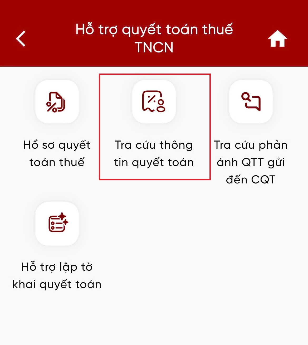 Đăng nhập vào ứng dụng eTax Mobile sau đó vào mục Tra cứu thông tin quyết toán hoặc Hỗ trợ quyết toán thuế TNCN