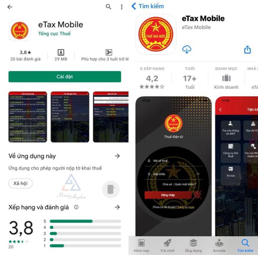 Truy cập vào App Stỏe (iOS) hoặc Google Play để tìm ứng dụng eTax Mobile do Tổng cụ Thuế phát hành và tiến àhnh cài đặt về máy.
