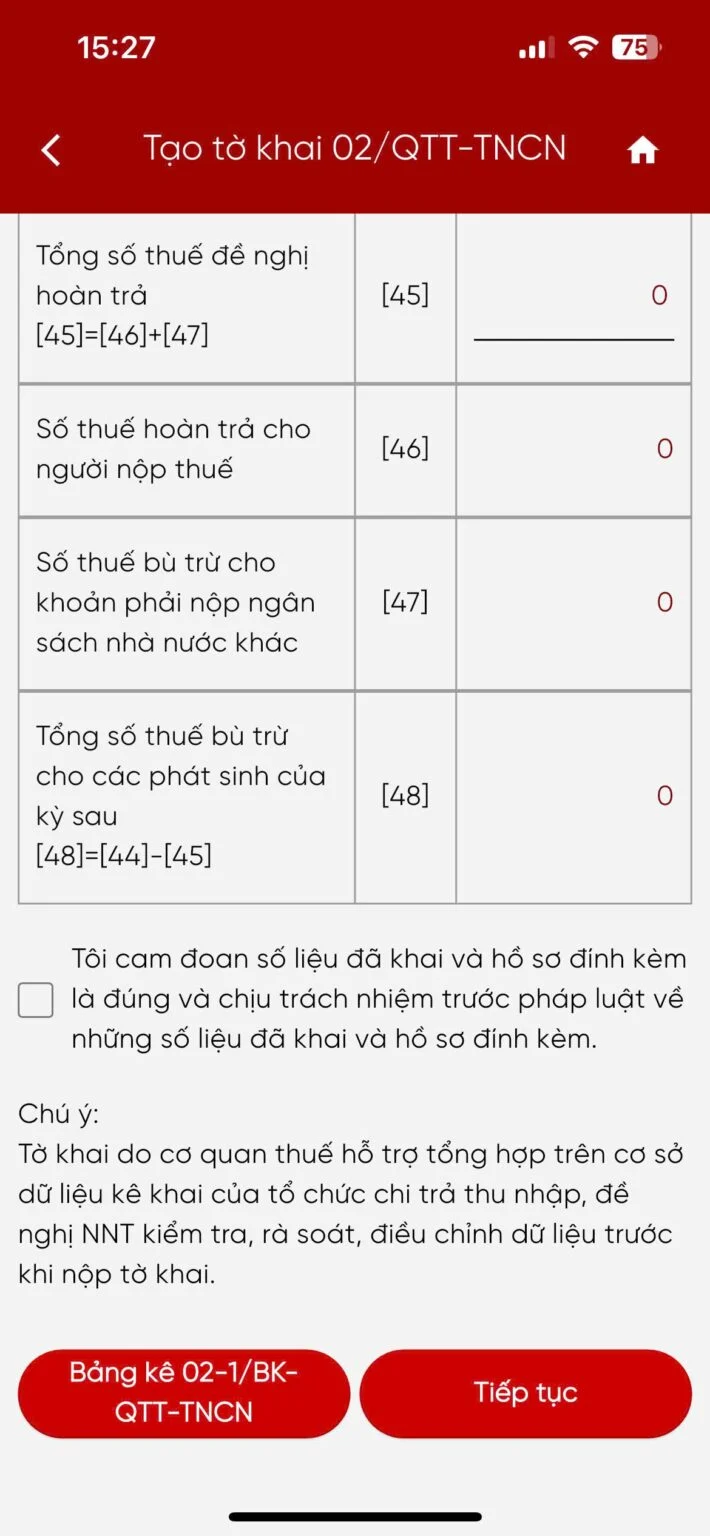 Chọn mục Tiếp tục để nhập các chỉ tiêu từ [20] đến [48] và có thể chỉnh sửa thông tin nếu cần.