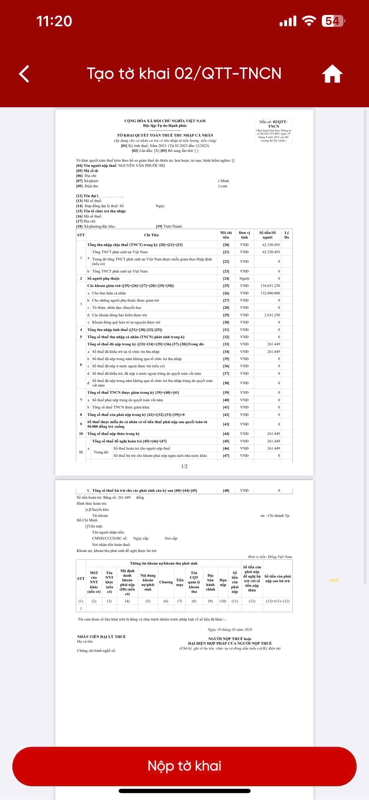 Màn hình sẽ hiển thị các thông tin kết quả, người nộp thuế cần kiểm tra kỹ các thông tin rồi nhấn Tạo tờ khai 02/QTT-TNCN gợi ý để hệ thống lập tờ khai dự thảo.