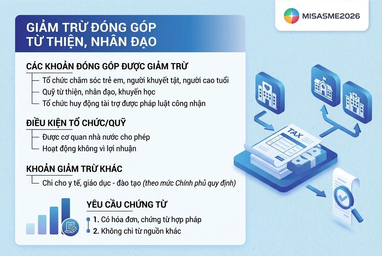 - Các khoản đóng góp từ thiện, nhân đạo hoặc chi phí y tế, giáo dục chỉ được tính giảm trừ khi có hóa đơn, chứng từ hợp pháp và không được thanh toán từ nguồn kinh phí khác như bảo hiểm hoặc tài trợ.