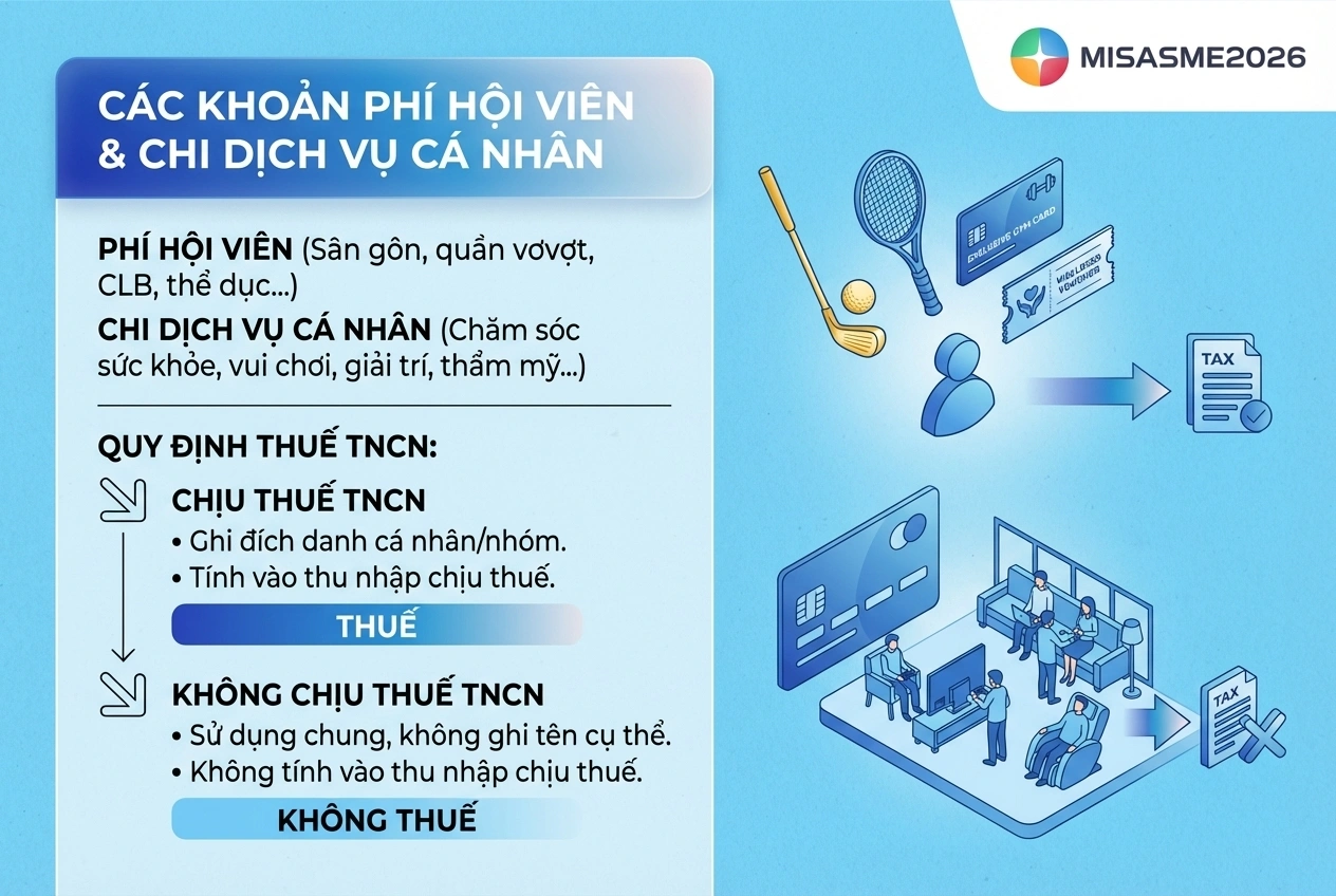 • Khoản phí hội viên: Bao gồm các loại thẻ như thẻ hội viên sân gôn, sân quần vợt, thẻ câu lạc bộ văn hóa nghệ thuật, thể dục thể thao… Trường hợp thẻ có ghi đích danh cá nhân hoặc nhóm cá nhân sử dụng thì khoản phí này tính vào thu nhập chịu thuế TNCN. Ngược lại, nếu thẻ được sử dụng chung, không ghi tên cá nhân hoặc nhóm cá nhân cụ thể thì không tính vào thu nhập chịu thuế.
