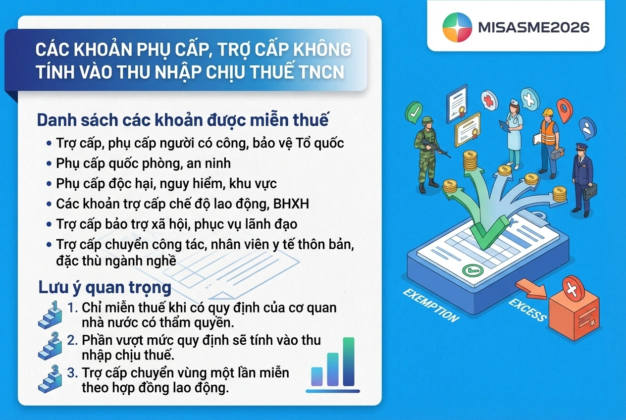 • Các khoản phụ cấp, trợ cấp nêu trên chỉ không tính thuế TNCN khi được cơ quan nhà nước có thẩm quyền quy định cụ thể về đối tượng và mức hưởng.