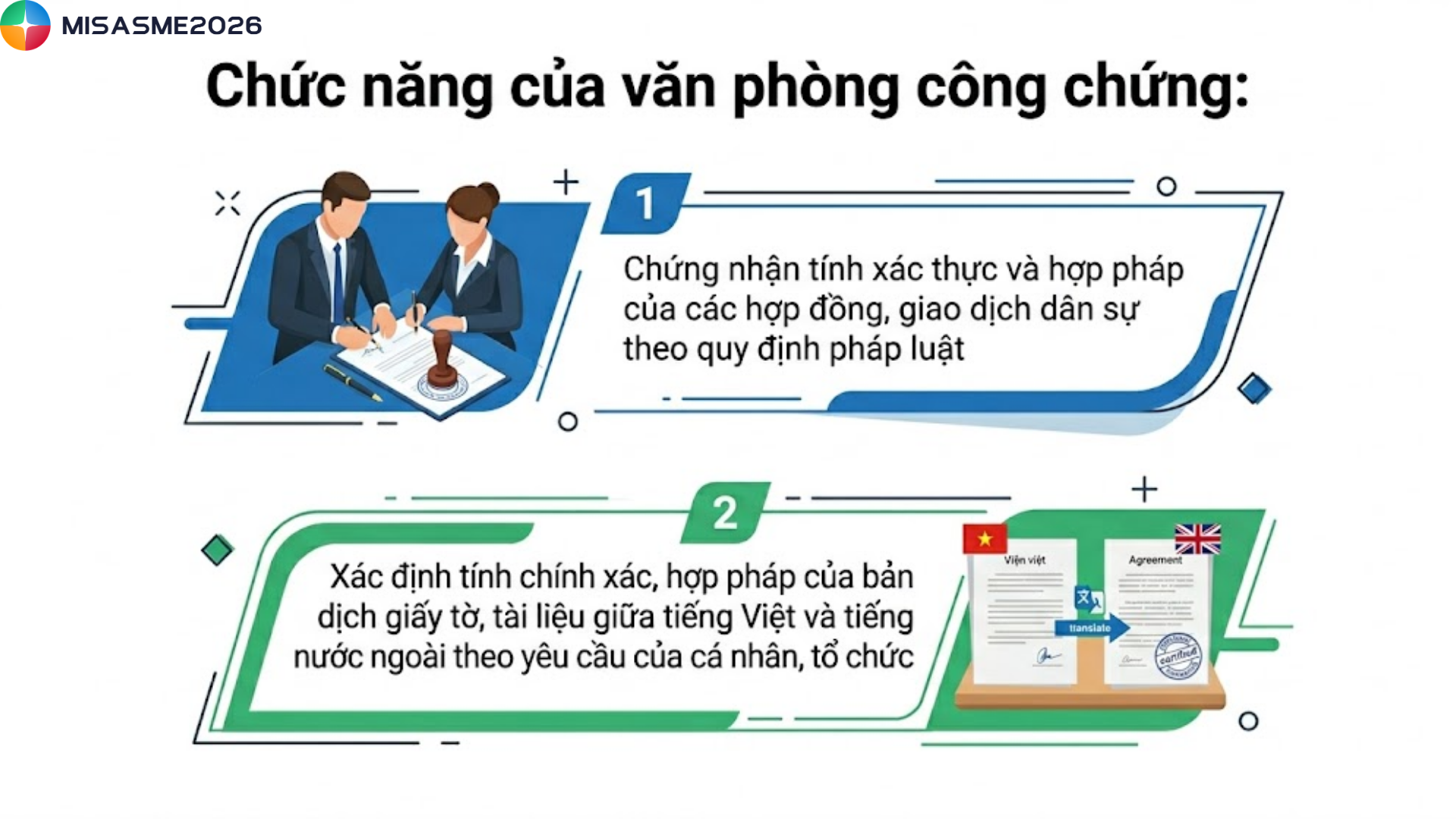iệc tìm hiểu điều kiện mở văn phòng công chứng là bước quan trọng đầu tiên đối với những cá nhân muốn hành nghề độc lập. Đây là lĩnh vực có quy định pháp lý chặt chẽ, yêu cầu cao về chuyên môn và điều kiện vận hành, nên nếu không nắm rõ từ đầu, bạn rất dễ gặp rủi ro khi làm hồ sơ hoặc bị từ chối cấp phép. Trong bài viết này, phần mềm kế toán MISA SME sẽ giúp bạn cập nhật đầy đủ các điều kiện, hồ sơ và thủ tục mới nhất.