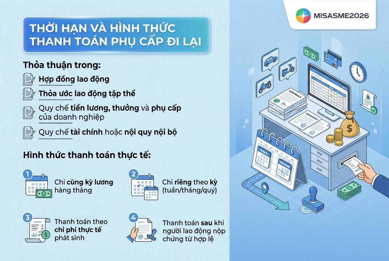 Hiện nay, pháp luật lao động không quy định riêng một thời hạn bắt buộc đối với phụ cấp đi lại. Do đó, thời điểm chi trả khoản này sẽ do doanh nghiệp và người lao động thỏa thuận, đồng thời được ghi nhận trong: