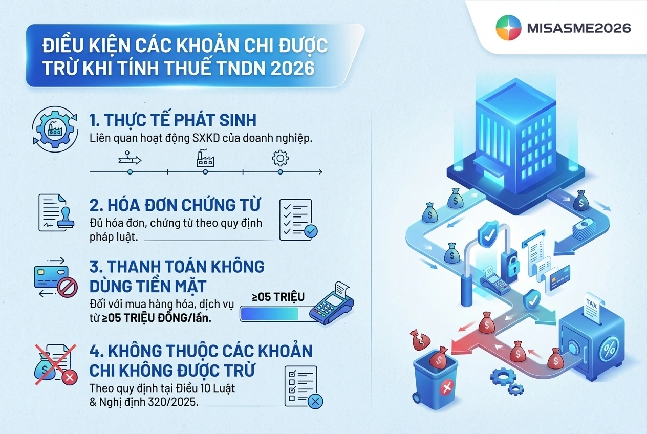 Căn cứ theo khoản 1 Điều 9 Luật thuế Thu nhập doanh nghiệp 2025 và Điều 9 Nghị định 320/2025/NĐ-CP, điều kiện để các khoản chi được trừ khi tính thuế TNDN 2026 bao gồm: