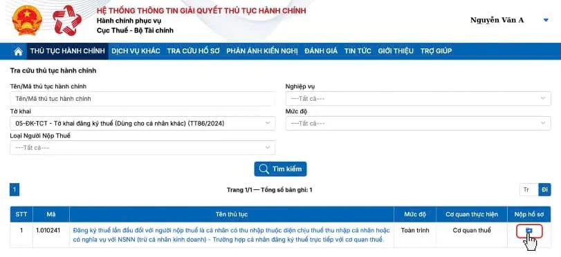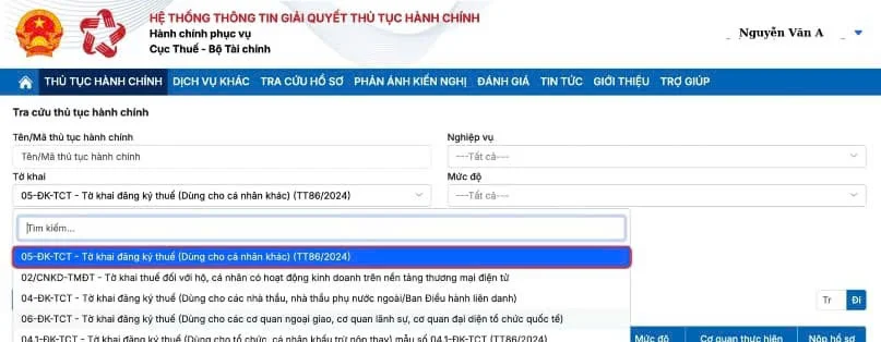 Sau khi đăng nhập thành công >> chọn Thủ tục hành chính => Chọn tờ khai “05-ĐK-TCT – Tờ khai đăng ký thuế (Dùng cho cá nhân khác) (TT86/2024) “