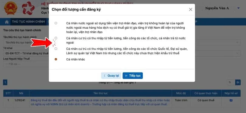 Hệ thống sẽ hiển thị các nhóm đối tượng đăng ký thuế. Cá nhân chọn đúng đối tượng phù hợp để hệ thống xác định mẫu biểu và thông tin cần khai báo.